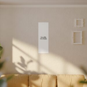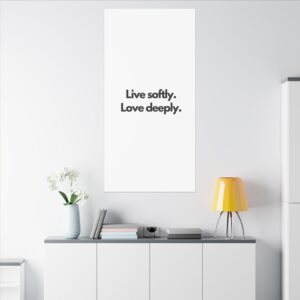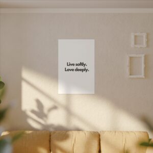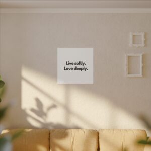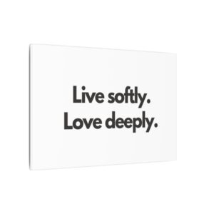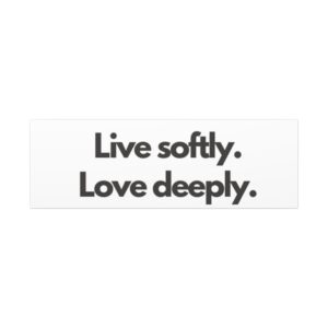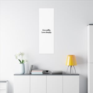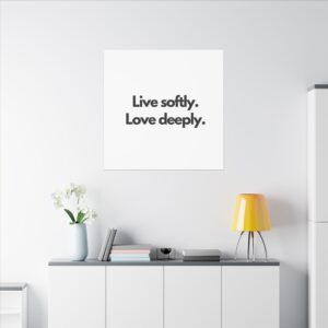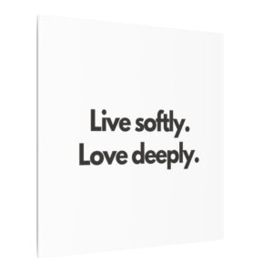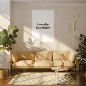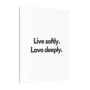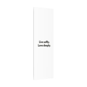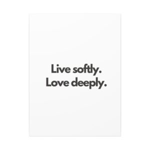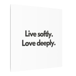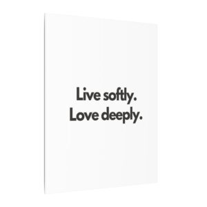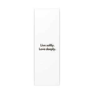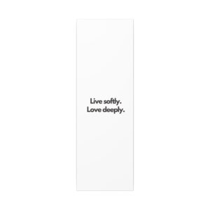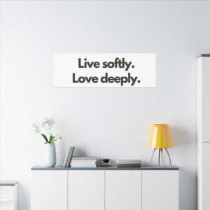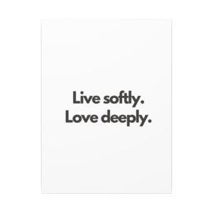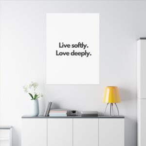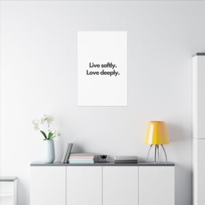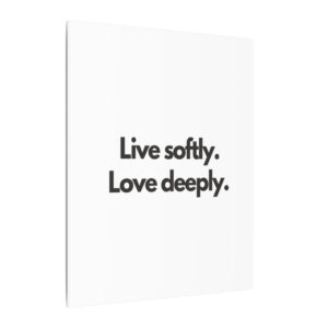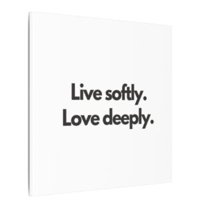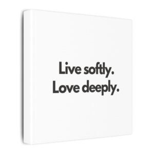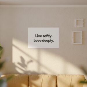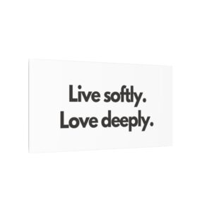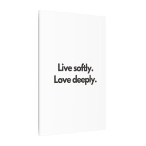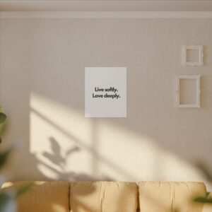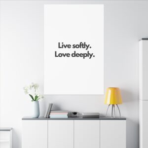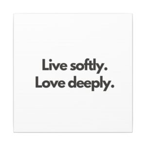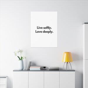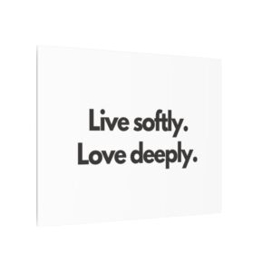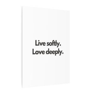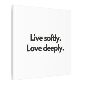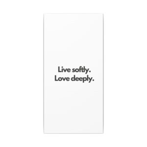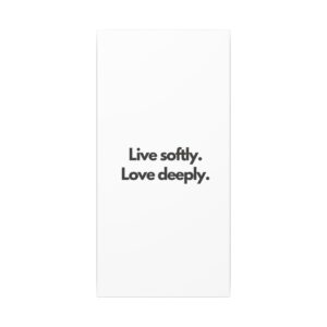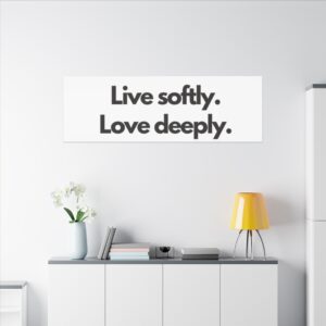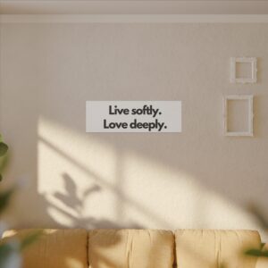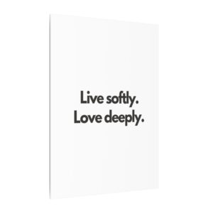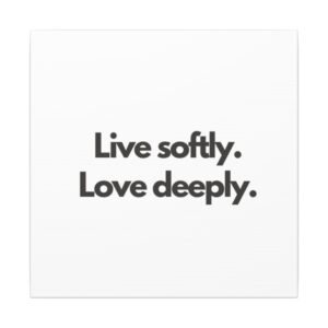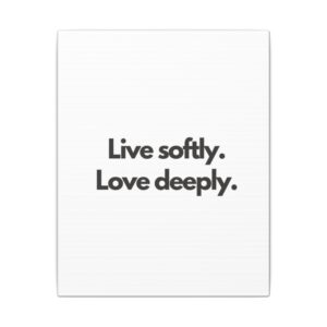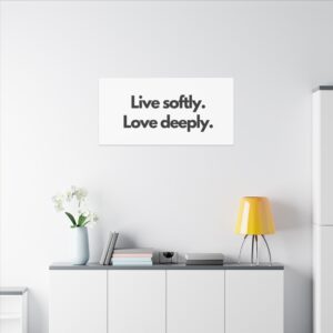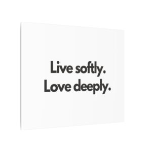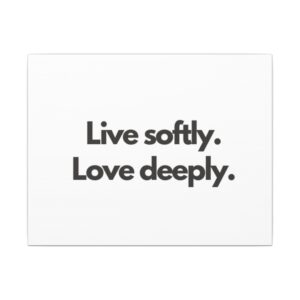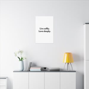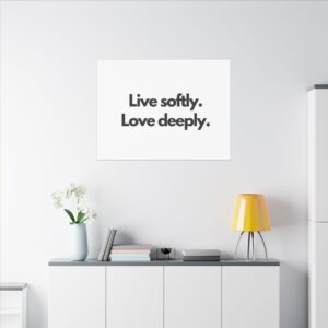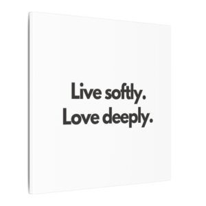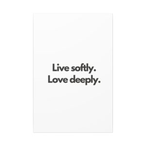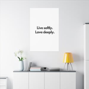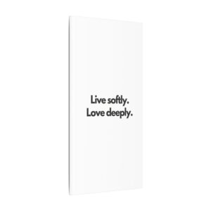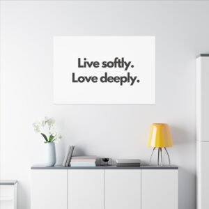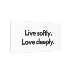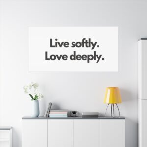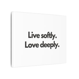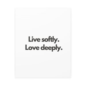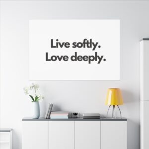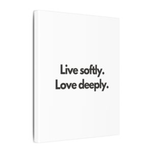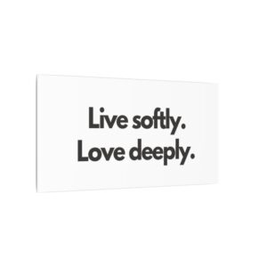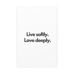 A minimalist stretched matte canvas with a calm, modern message: “Live softly. Love deeply.” Clean black type on a soft white ground creates a quiet focal point that brings a gentle, reflective energy to any wall. The slim 0.75″ profile keeps the look light and contemporary while the satin, coated surface holds crisp, Greenguard Gold–certified color for long-lasting clarity. This canvas reads like a daily reminder—a soft nudge toward slower rhythms and deeper connections. It suits a bedroom, reading nook, or living area where subtlety and intention matter. Hang it solo for a whisper of meaning, or pair with warm woods and natural textiles to amplify a cozy, mindful atmosphere.