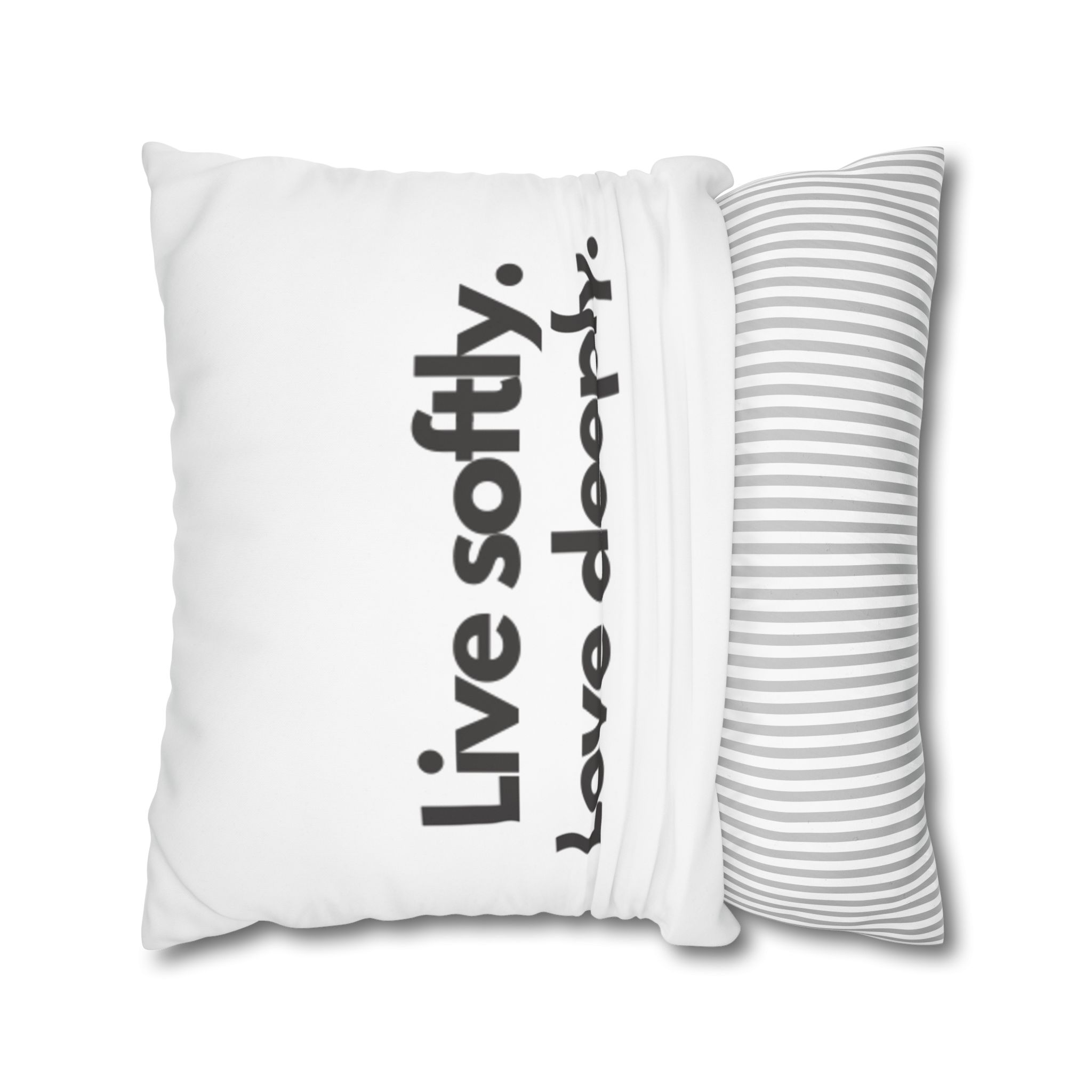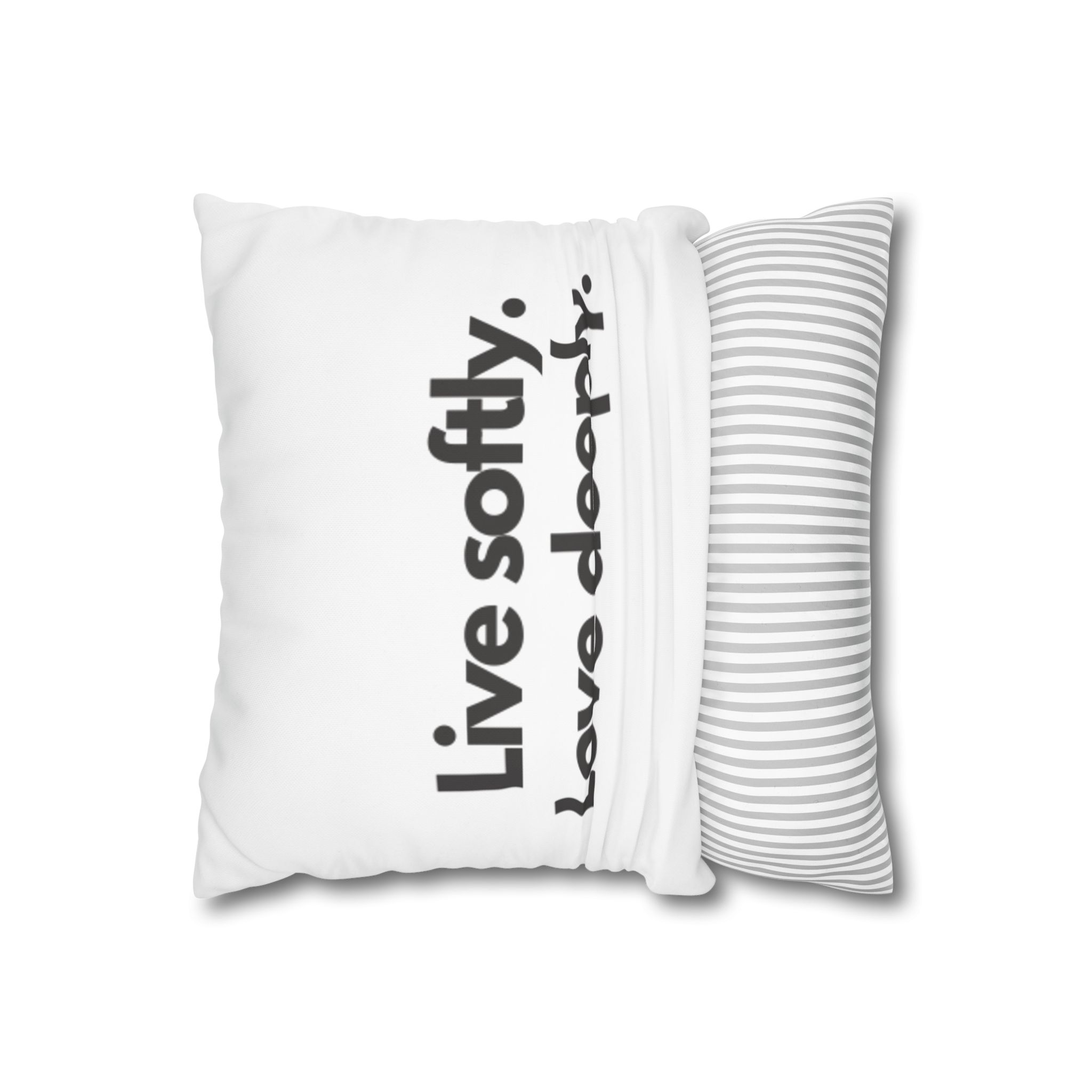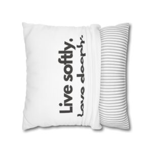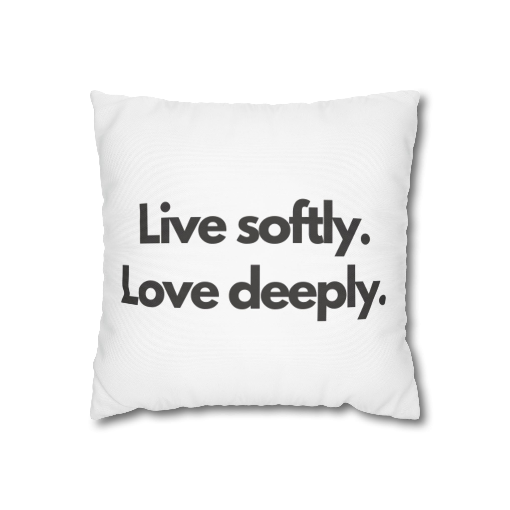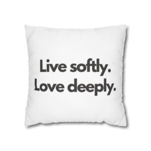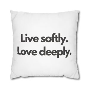 Quiet and comforting, this square poly canvas pillowcase reads like a gentle reminder: Live softly. Love deeply. The clean, modern type sits on a soft white canvas that feels smooth to the touch and holds crisp, dark printing on both sides. Slip it over your favorite pillow to add a calm, minimalist touch to a reading nook, bedroom, or cozy corner. The concealed zipper keeps the silhouette tidy while the durable polyester weave stands up to everyday use and keeps the bold lettering clear for years.