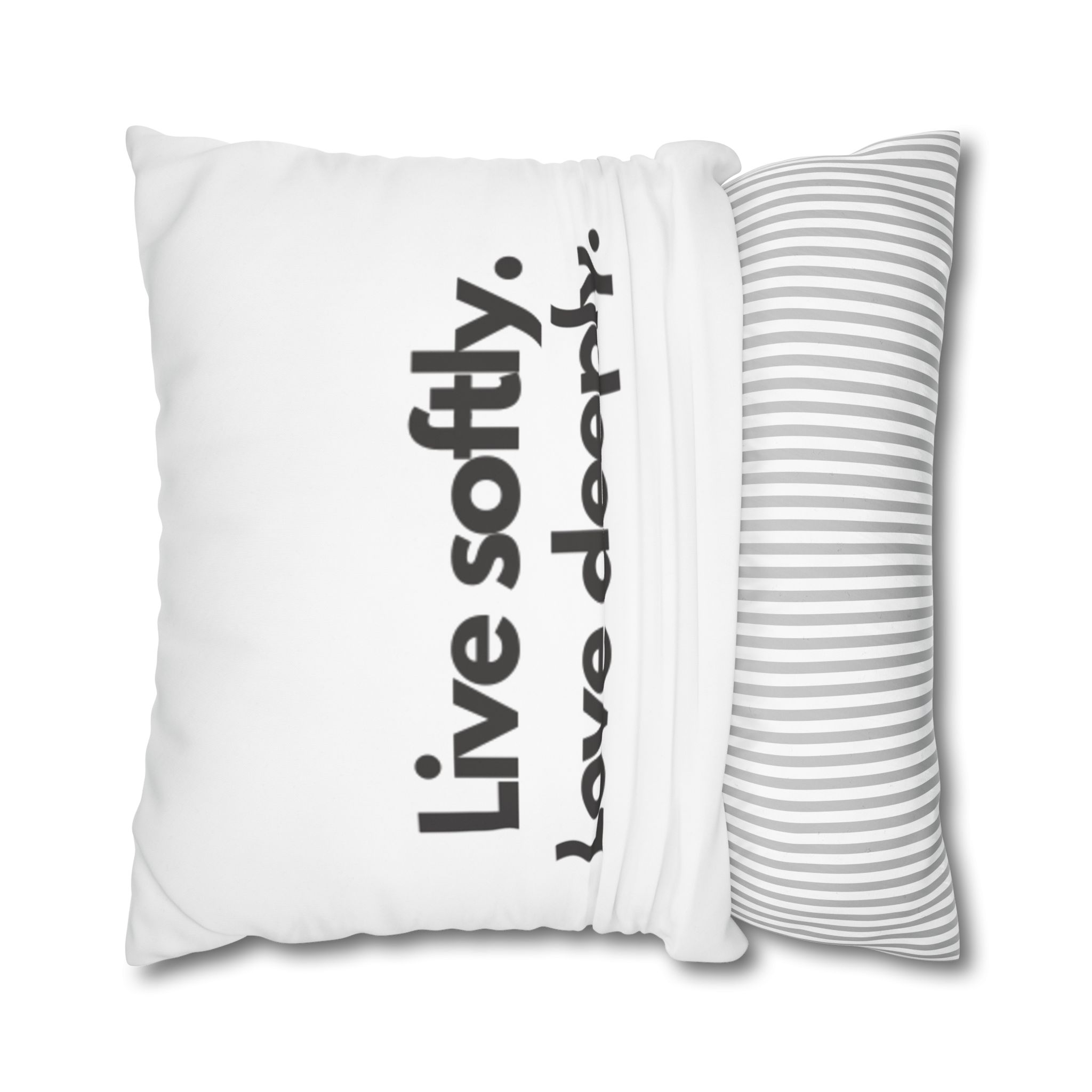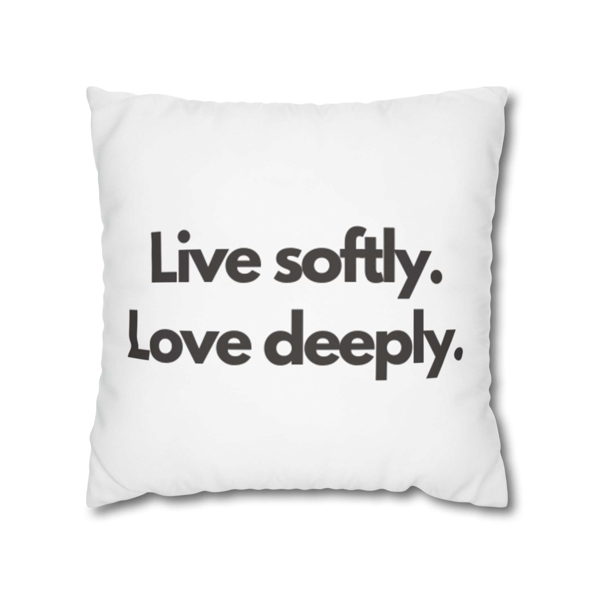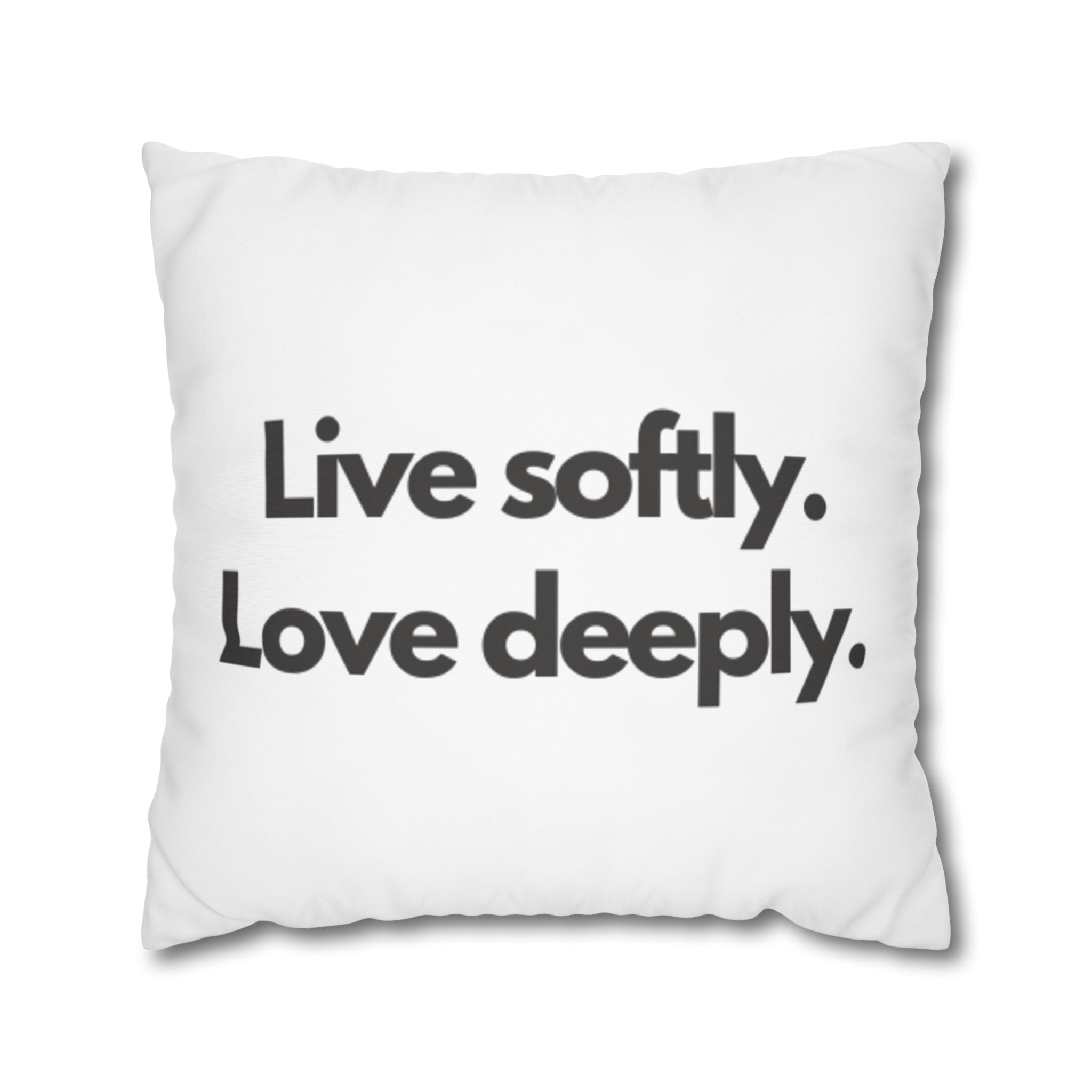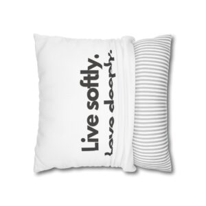 Quiet and comforting, this square poly canvas pillowcase reads like a gentle reminder: Live softly. Love deeply. The clean, modern type sits on a soft white canvas that feels smooth to the touch and holds crisp, dark printing on both sides. Slip it over your favorite pillow to add a calm, minimalist touch to a reading nook, bedroom, or cozy corner. The concealed zipper keeps the silhouette tidy while the durable polyester weave stands up to everyday use and keeps the bold lettering clear for years.