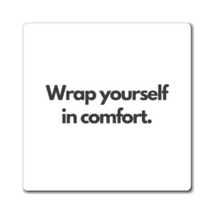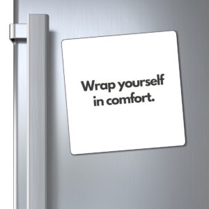 A simple, modern magnet that brings a little quiet encouragement to your everyday spaces. Clean, black type on a matte white background reads “Wrap yourself in comfort.” — a gentle reminder to slow down, grab a warm drink, and settle in. The thin, lightweight vinyl face is laminated for durability and sits on a strong black magnetic backing so it clings to refrigerators, lockers, filing cabinets, or any metal surface without bulk. The understated square design blends into minimalist kitchens, cozy reading nooks, and office cubicles alike, offering a small moment of calm whenever you pass by.