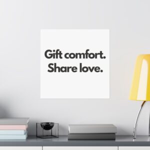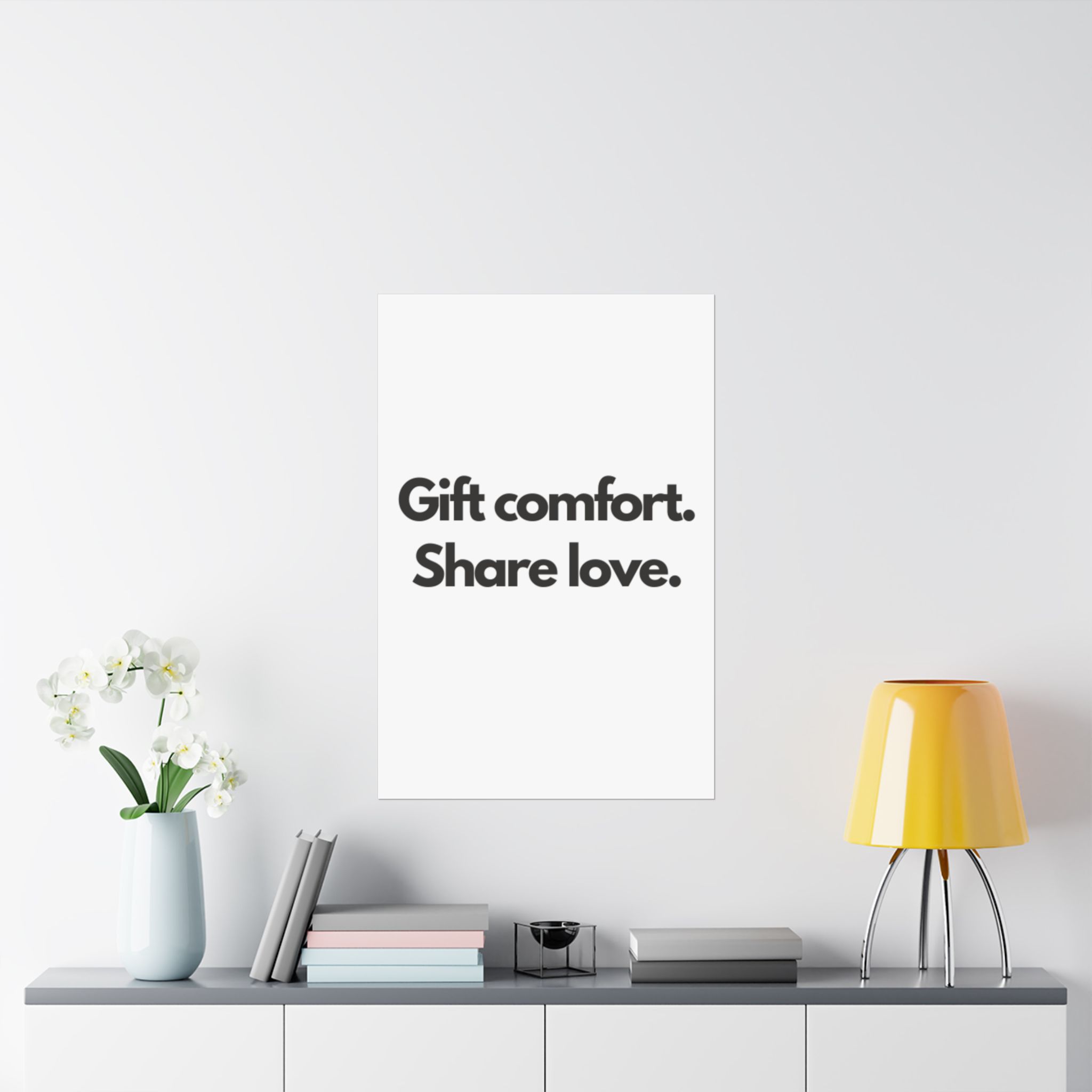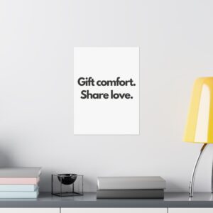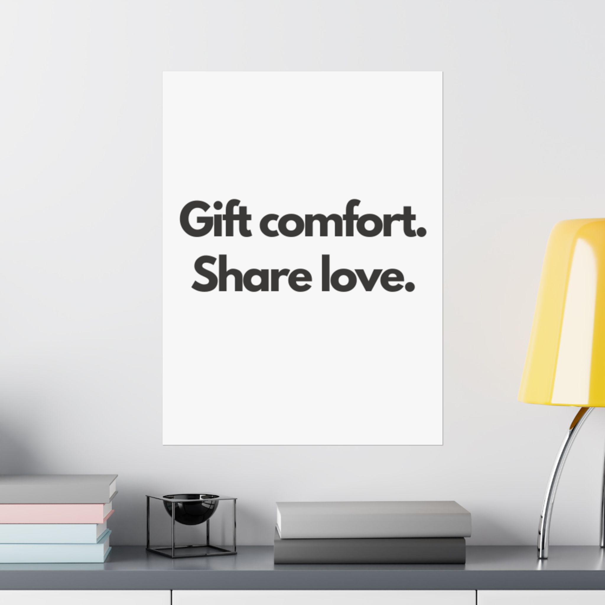 This matte vertical poster speaks with calm confidence. Clean black type on archival white paper carries the message “Gift comfort. Share love.” in a modern, rounded sans-serif—quiet but purposeful. The matte finish softens glare and gives the print a gallery feel while the giclée process keeps the deep blacks vivid over time. Hang it in a living room, foyer, or bedroom to anchor a warm, intentional corner where visitors and family are reminded to slow down and care for one another. It pairs naturally with cozy textiles and natural wood frames, and the variety of available sizes lets you place this message as a subtle wall whisper or a statement focal point. Designed for indoor spaces, made on museum-grade archival paper for lasting color fidelity.