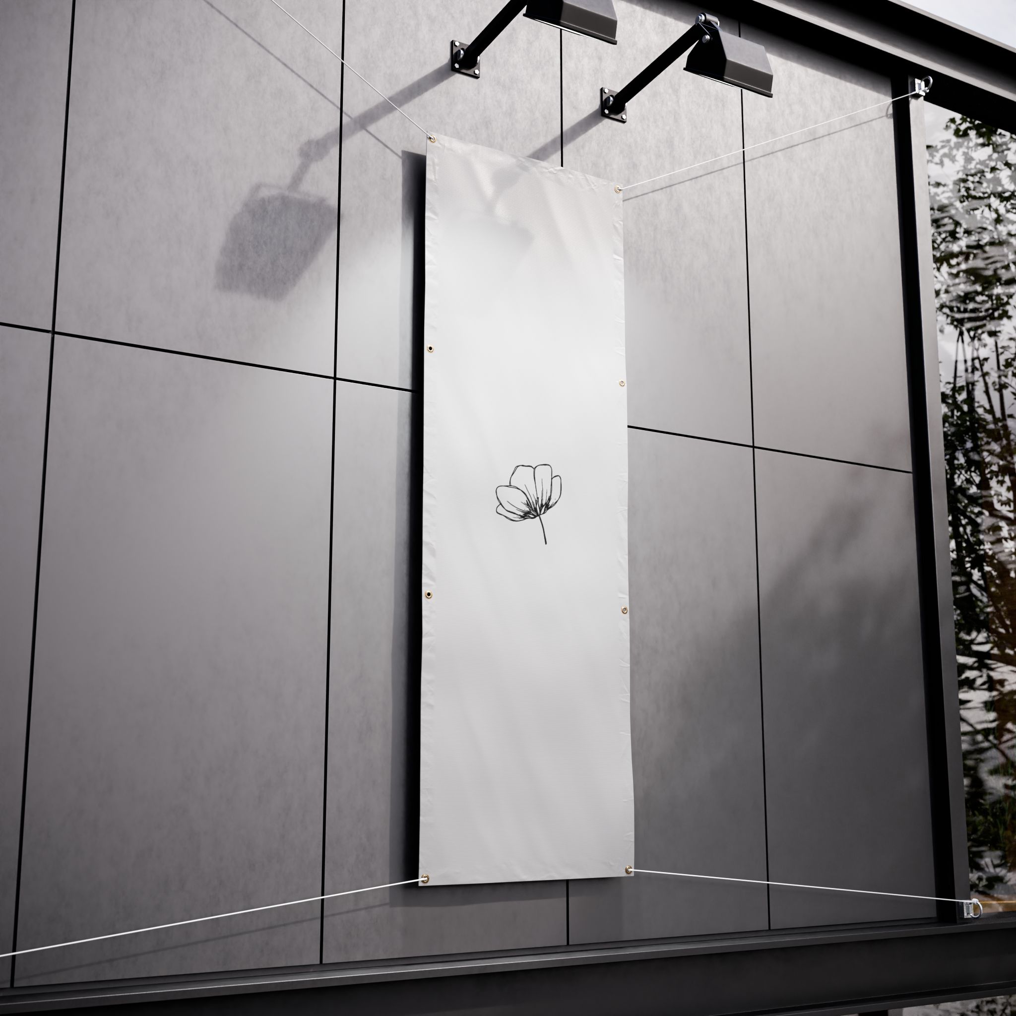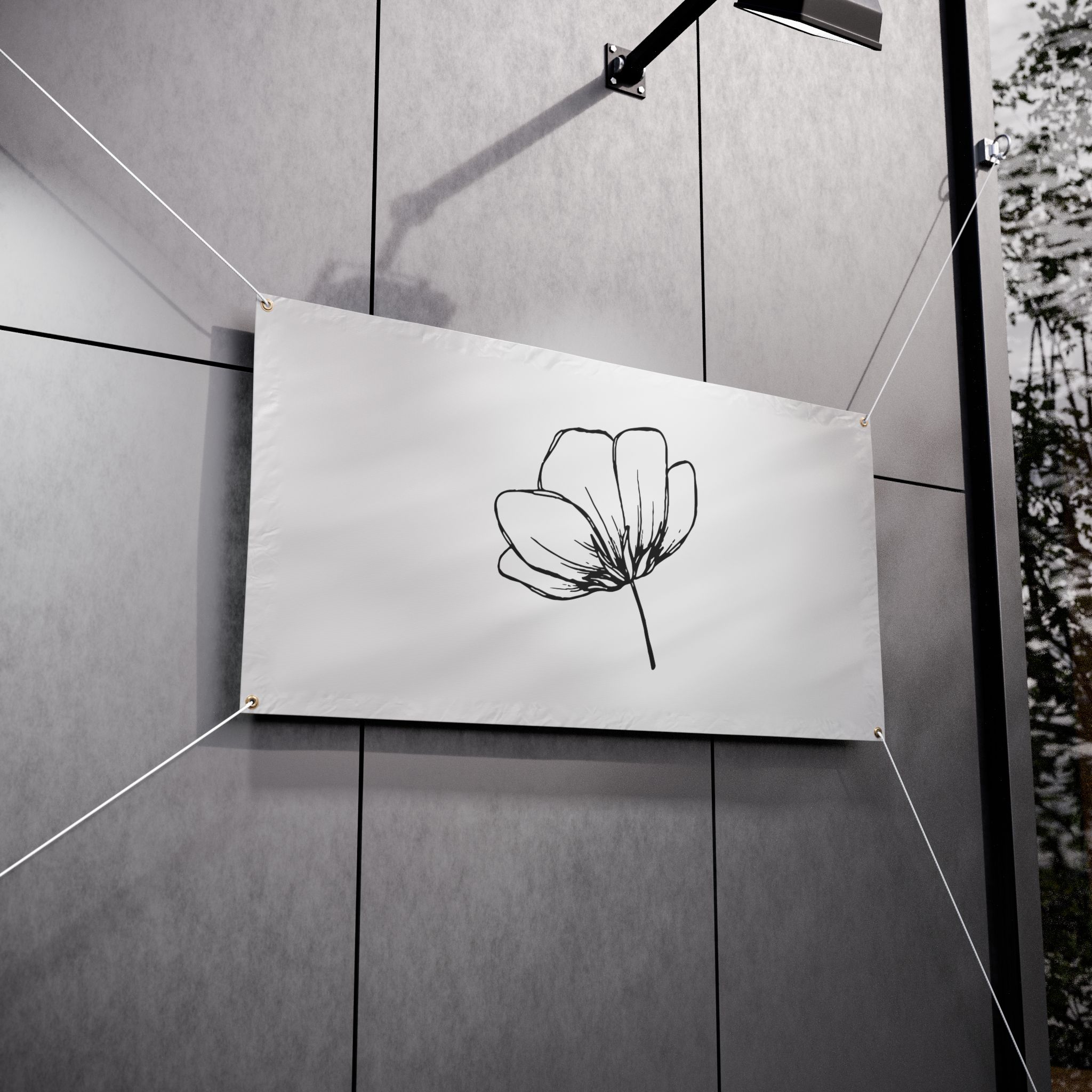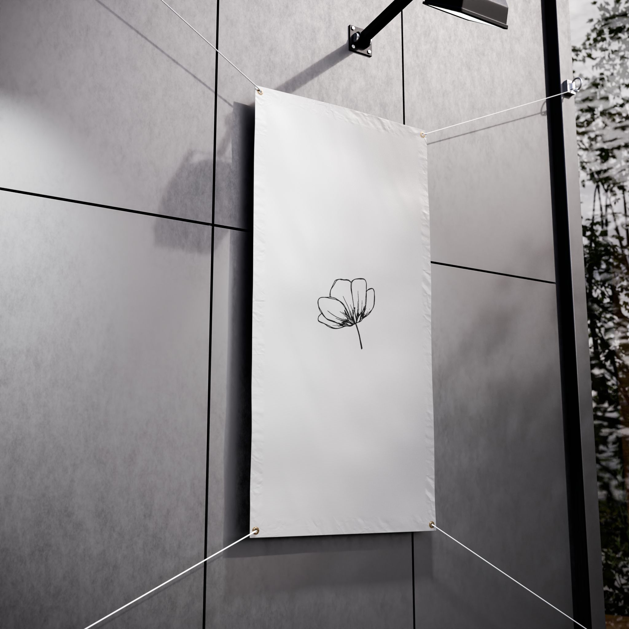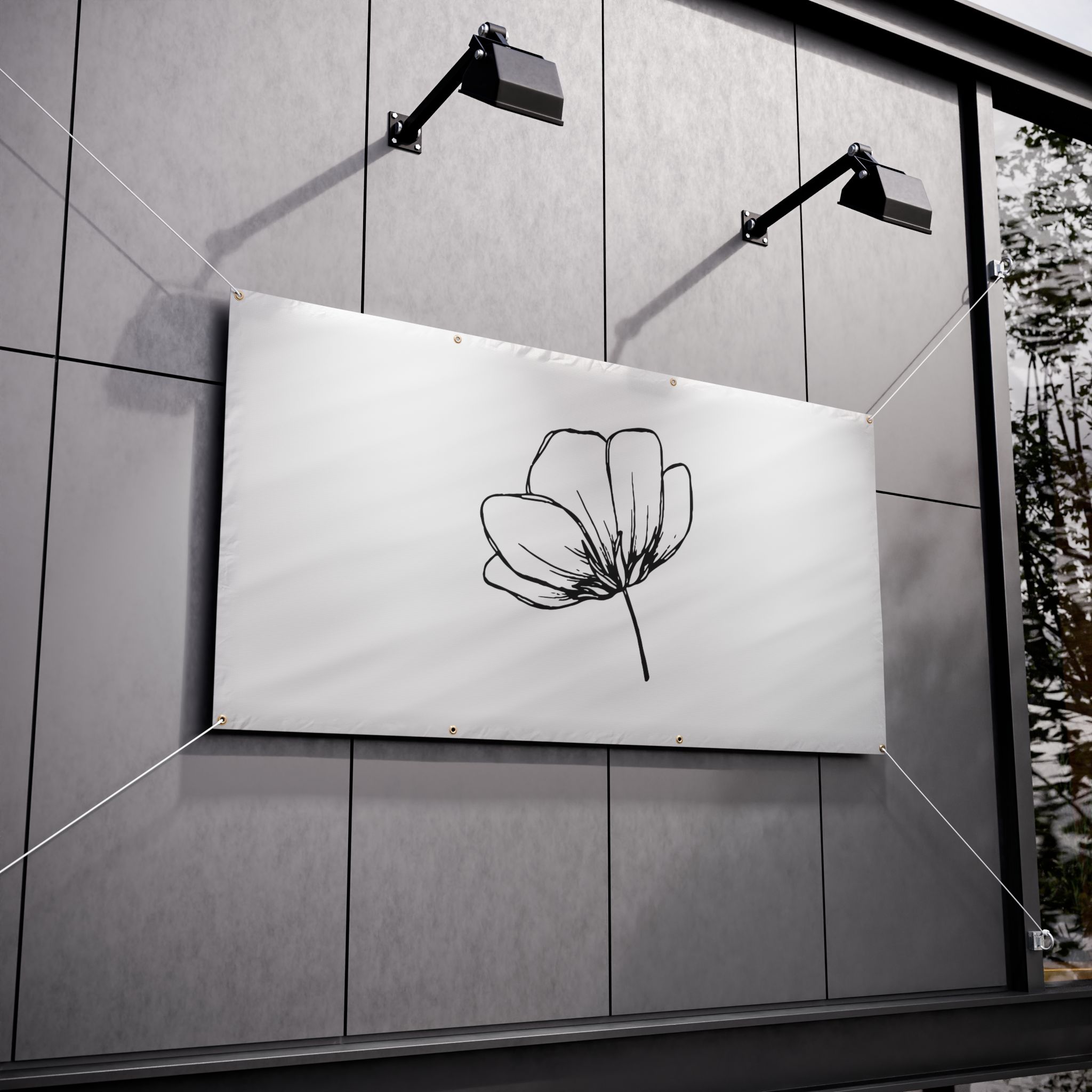 A clean, weather-ready vinyl banner that brings quiet elegance to yards, fences, markets, and storefronts. Printed on heavy-duty Titan™ 10 oz scrim vinyl with heat-welded hems and corner grommets, the banner holds up to wind, rain, and sun while keeping colors bright and lines crisp. The minimal single-line floral design reads from a distance and adds a calm, modern touch to outdoor spaces or temporary indoor displays. Choose from horizontal or vertical layouts and three practical sizes to suit a small market stall, garden fence, or event backdrop. Hanging ropes are not included, so you can customize mounting to your space.