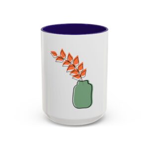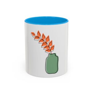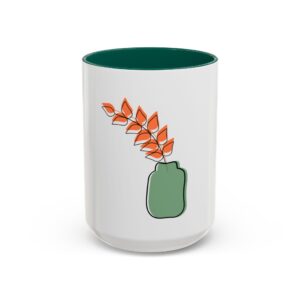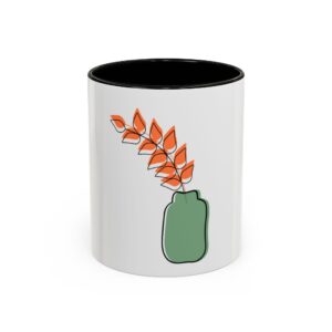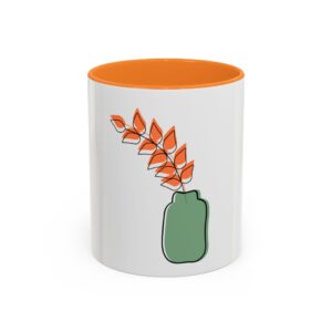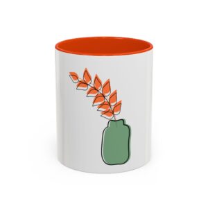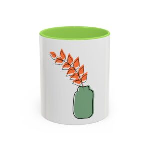 A bright, cozy ceramic mug that turns a simple sip into a small, mindful moment. The minimalist botanical illustration — a soft green vase holding warm, orange sprigs — feels like a quick breath of autumn light on your kitchen counter. Choose from a dozen accent colors for the handle and inside to match your space, and pick 11oz for a compact morning cup or 15oz when you linger with your tea. The glossy ORCA finish keeps the print vivid through daily use, while the comfortable C-handle fits your hand without fuss. This mug brings calm, color, and a little handcrafted charm to everyday rituals and quiet, hyggelig mornings.