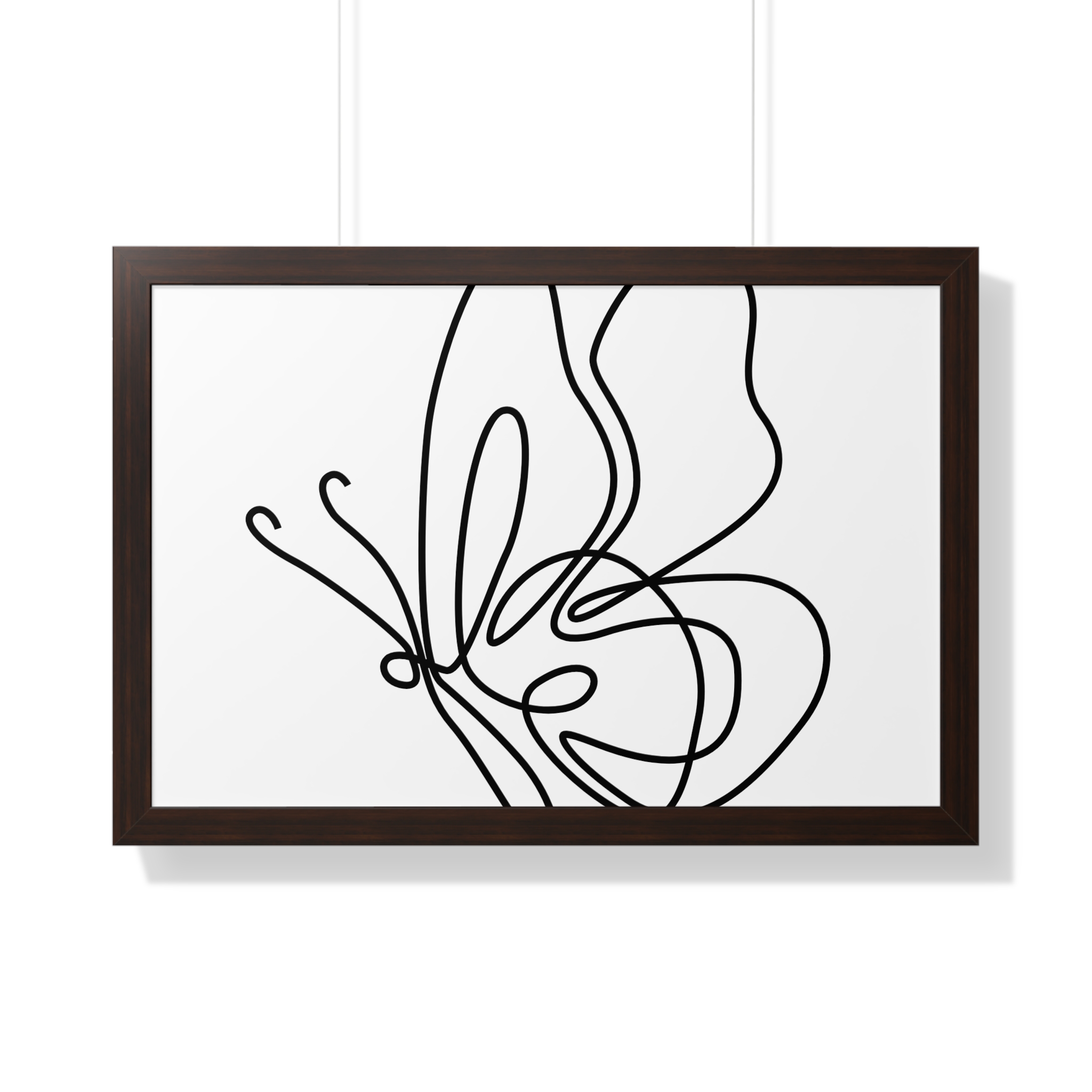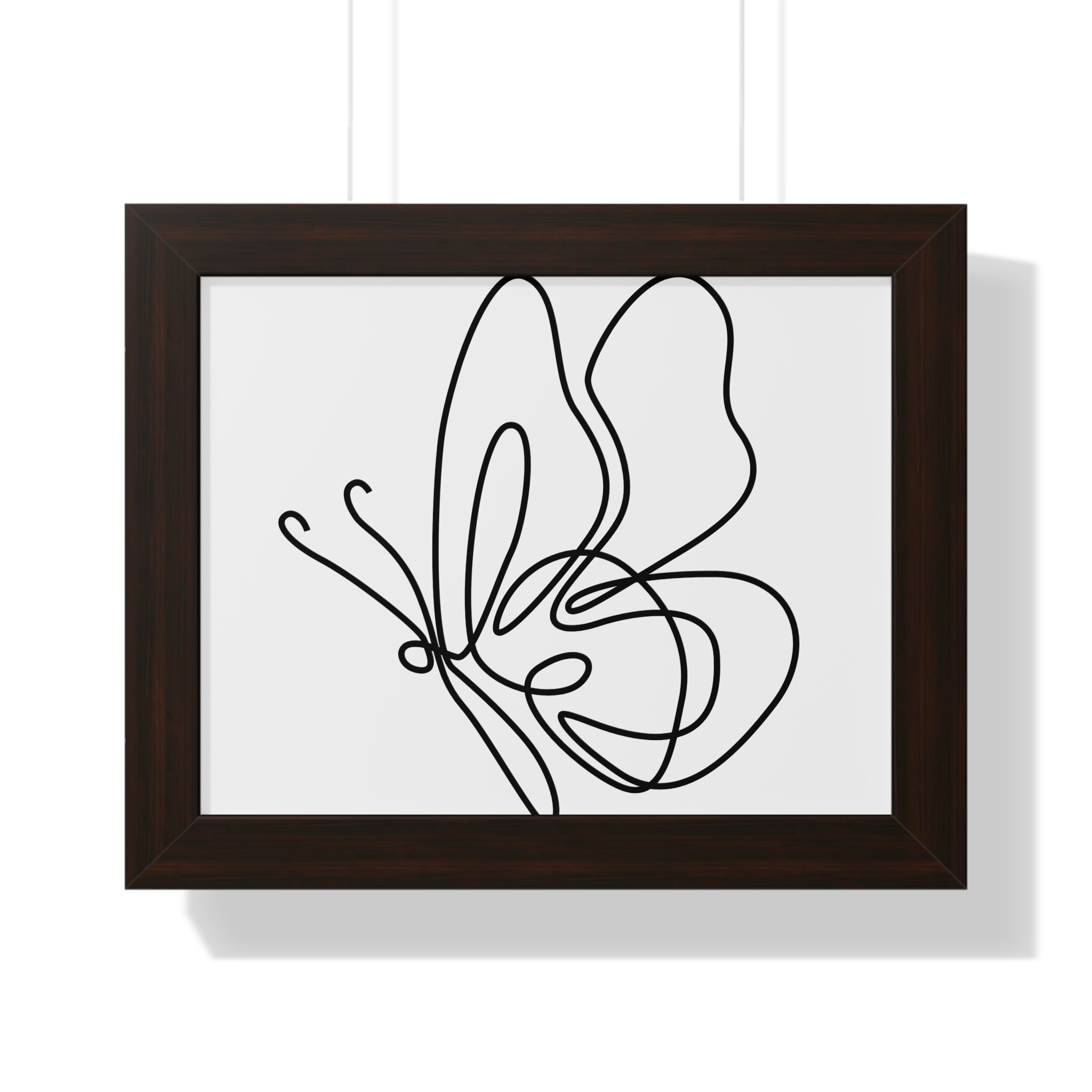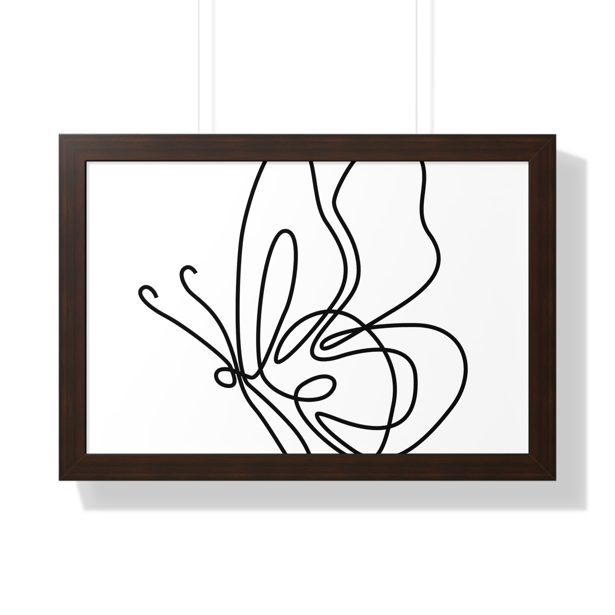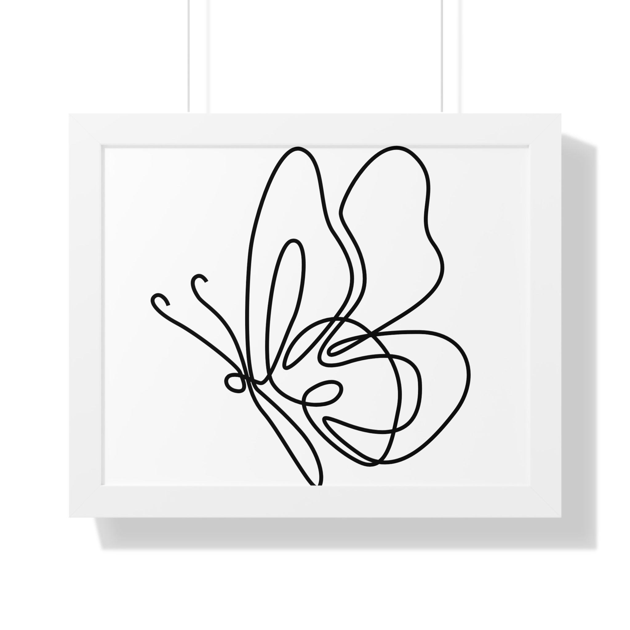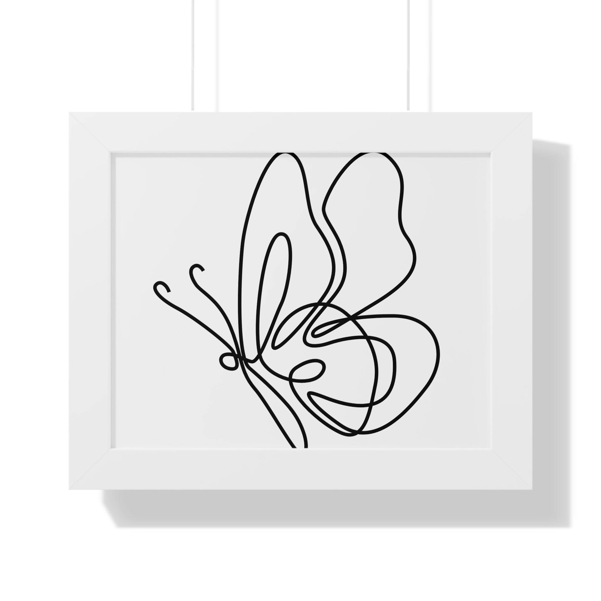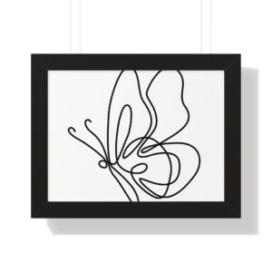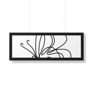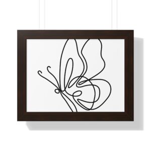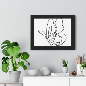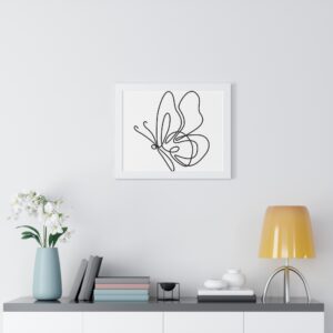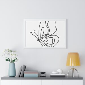 A framed horizontal poster featuring a minimalist continuous-line butterfly sketch. The clean black linework on matte museum-grade paper brings an airy, contemplative pause to any room. Housed in a slim MDF frame with a protective acrylic cover, the print arrives ready to hang with pre-installed hardware and a fixed hanging kit. Available in black, walnut, or white frame finishes, this understated piece slips easily into living rooms, entryways, or home offices — a quiet accent that complements plants, ceramics, and neutral décor while adding a touch of organic movement to the wall.