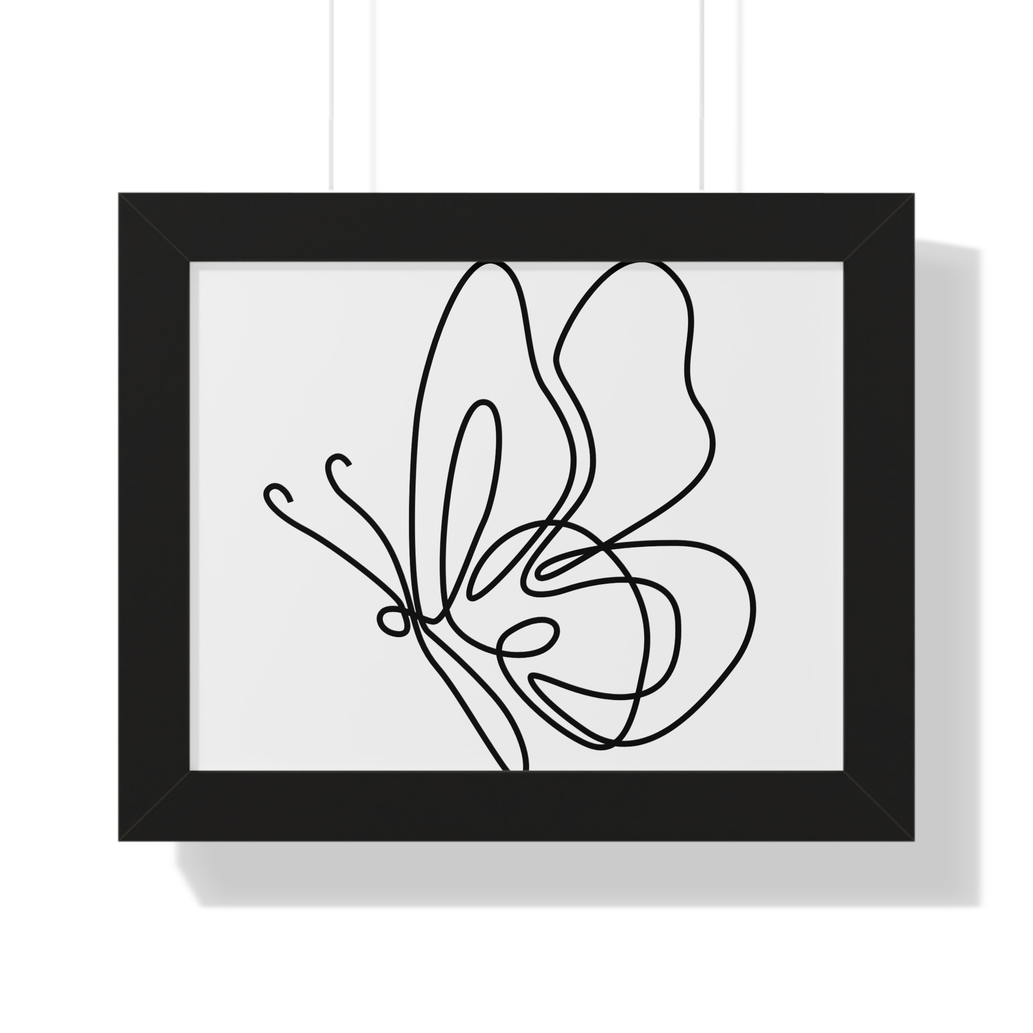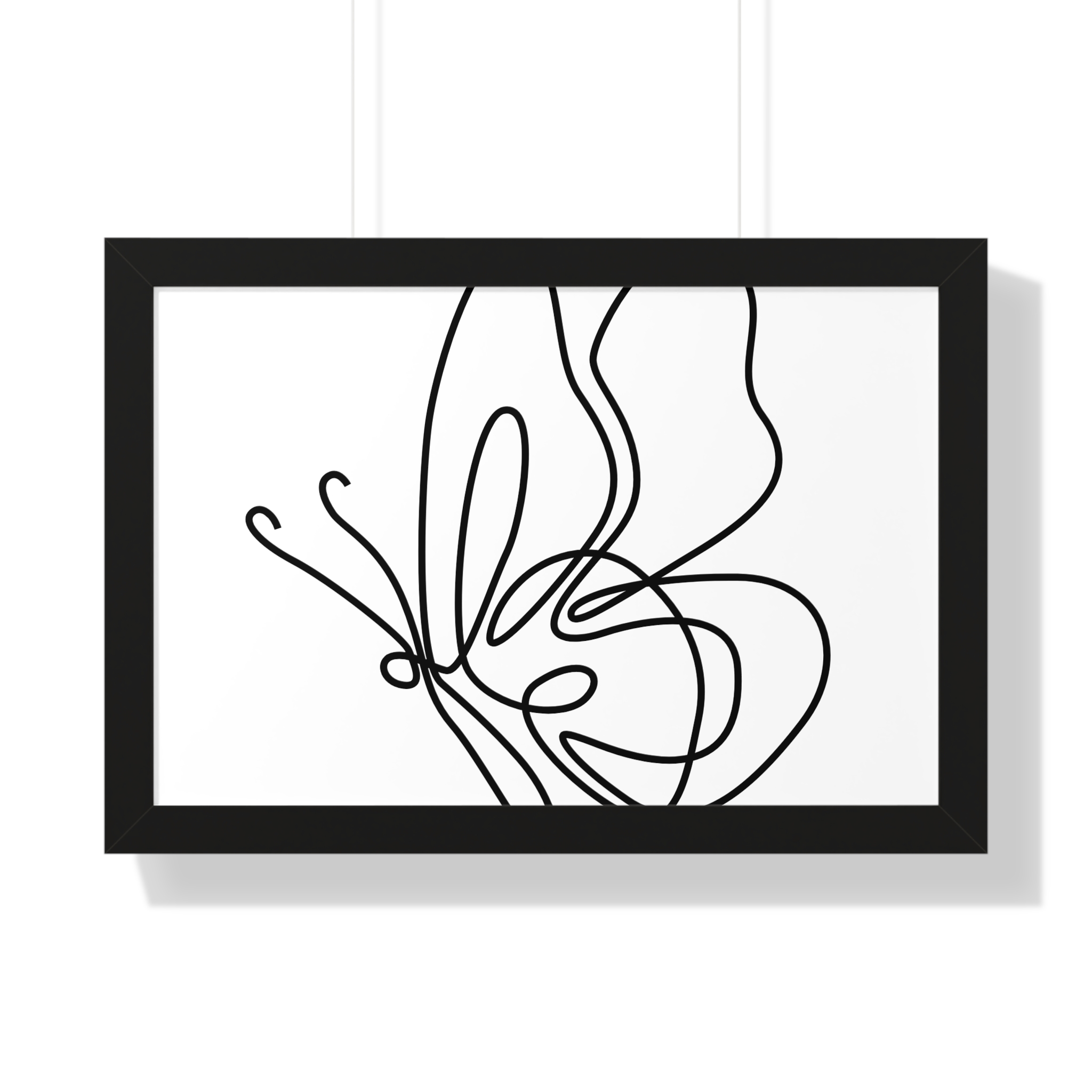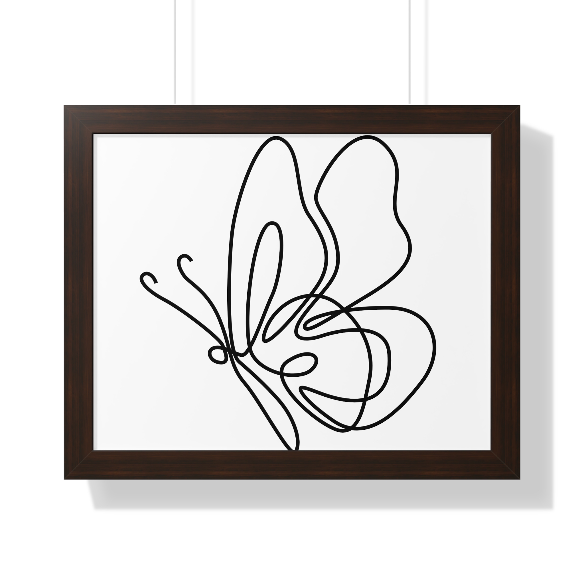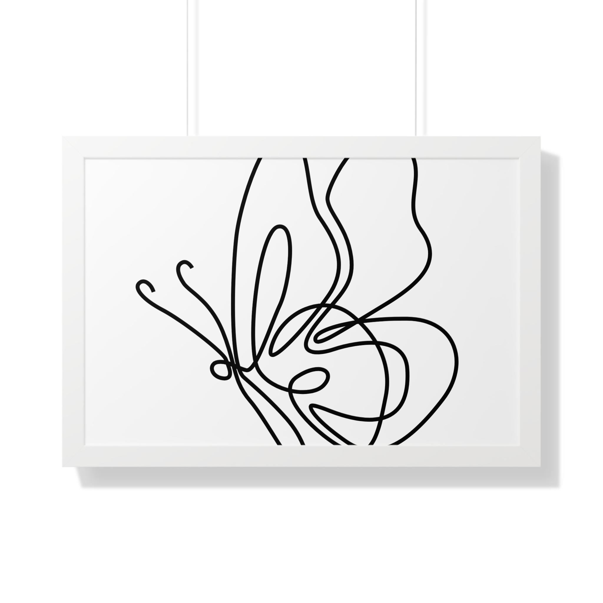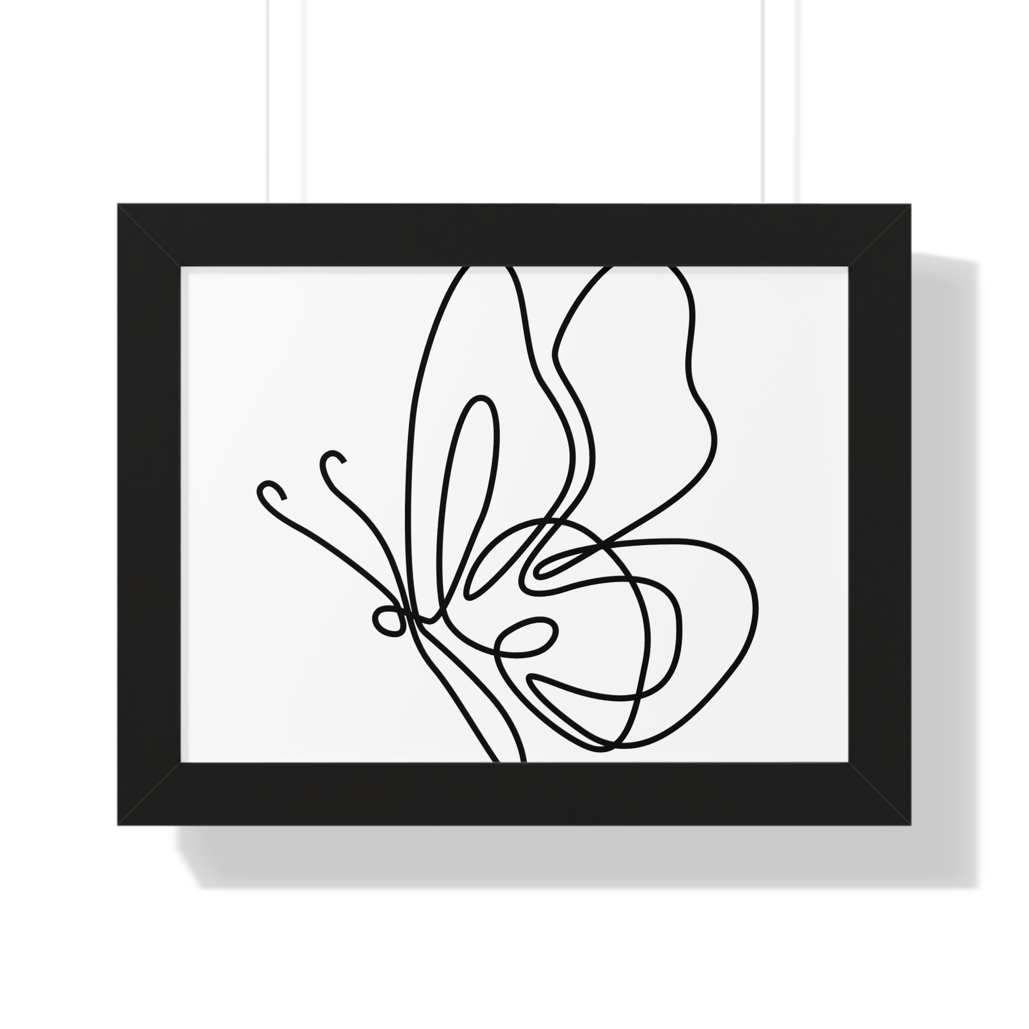 A framed horizontal poster featuring a minimalist continuous-line butterfly sketch. The clean black linework on matte museum-grade paper brings an airy, contemplative pause to any room. Housed in a slim MDF frame with a protective acrylic cover, the print arrives ready to hang with pre-installed hardware and a fixed hanging kit. Available in black, walnut, or white frame finishes, this understated piece slips easily into living rooms, entryways, or home offices — a quiet accent that complements plants, ceramics, and neutral décor while adding a touch of organic movement to the wall.