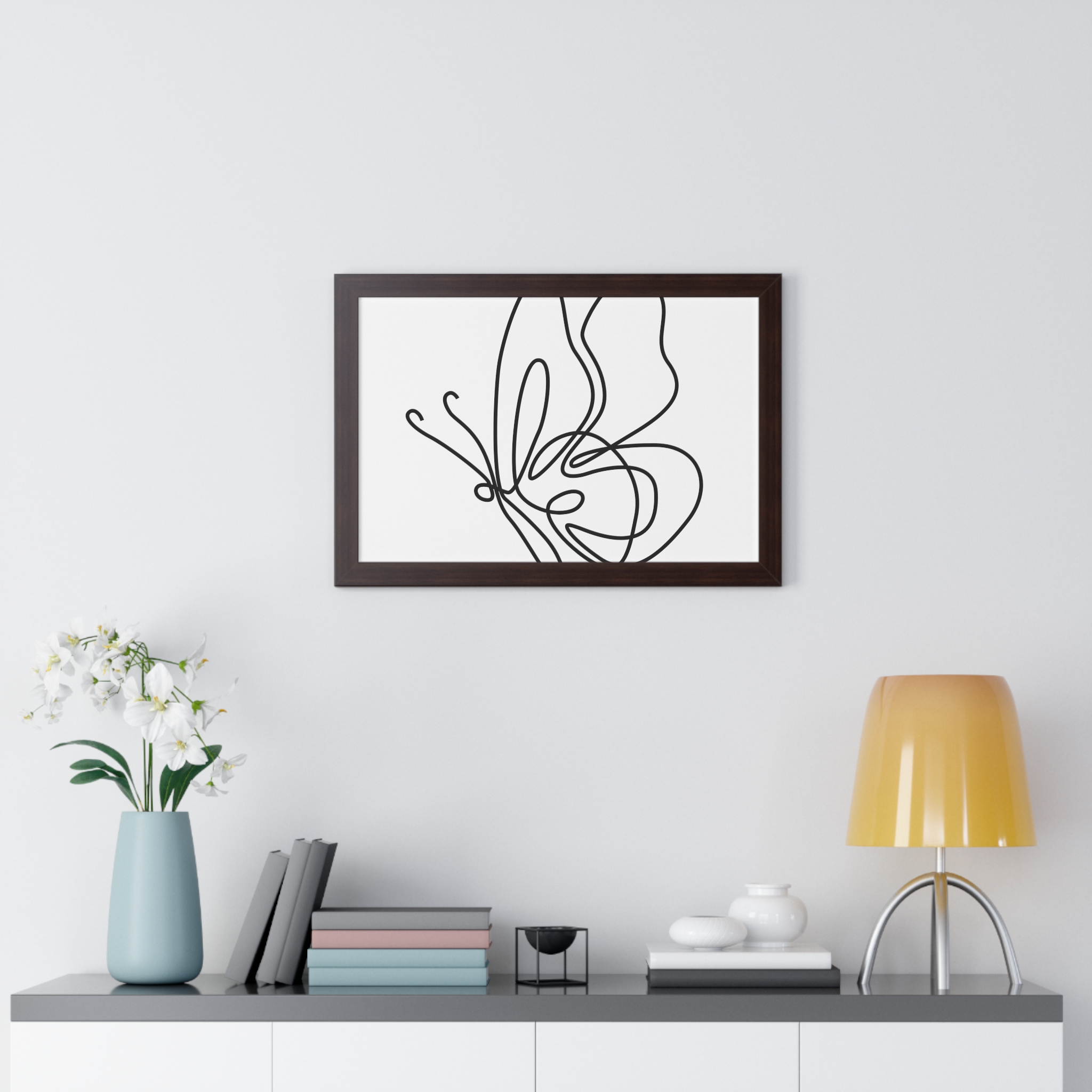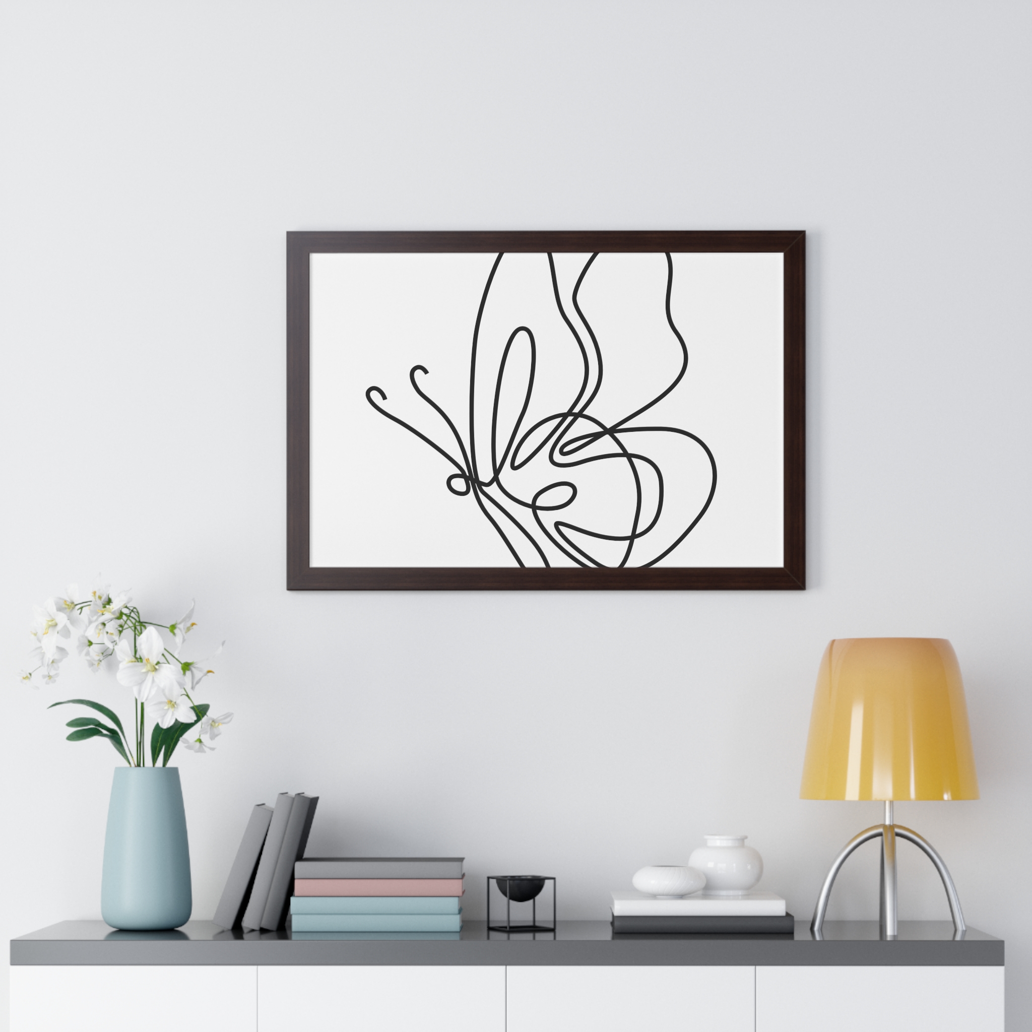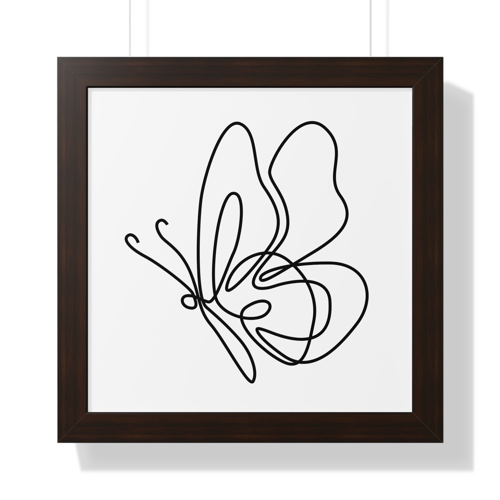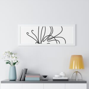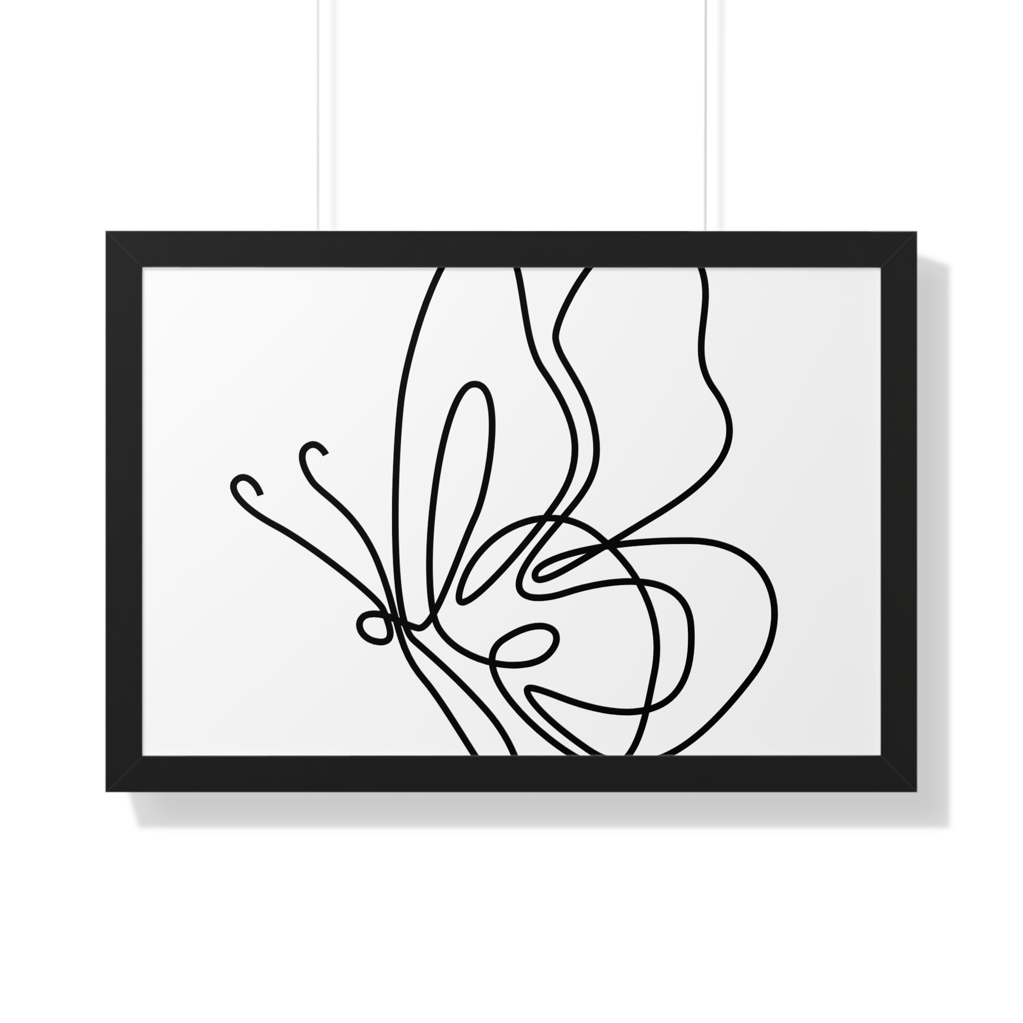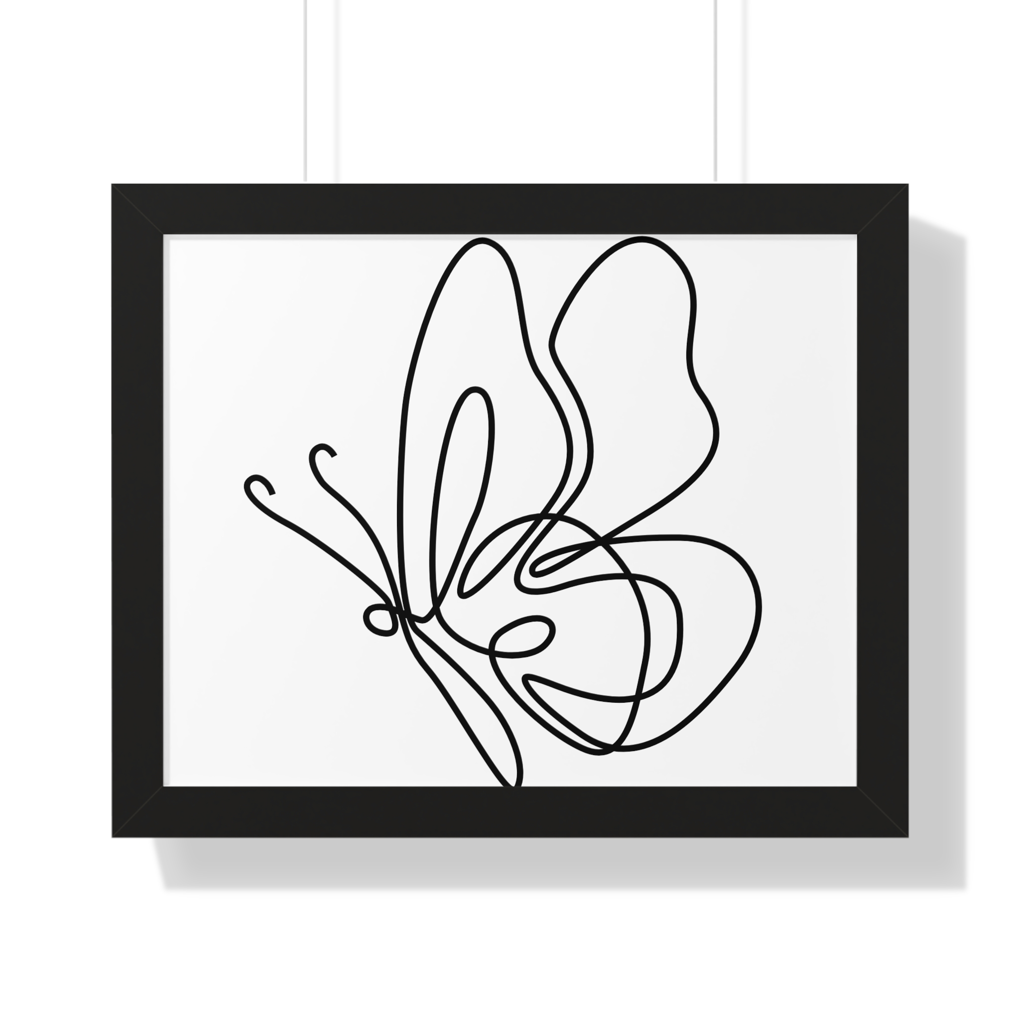 A framed horizontal poster featuring a minimalist continuous-line butterfly sketch. The clean black linework on matte museum-grade paper brings an airy, contemplative pause to any room. Housed in a slim MDF frame with a protective acrylic cover, the print arrives ready to hang with pre-installed hardware and a fixed hanging kit. Available in black, walnut, or white frame finishes, this understated piece slips easily into living rooms, entryways, or home offices — a quiet accent that complements plants, ceramics, and neutral décor while adding a touch of organic movement to the wall.