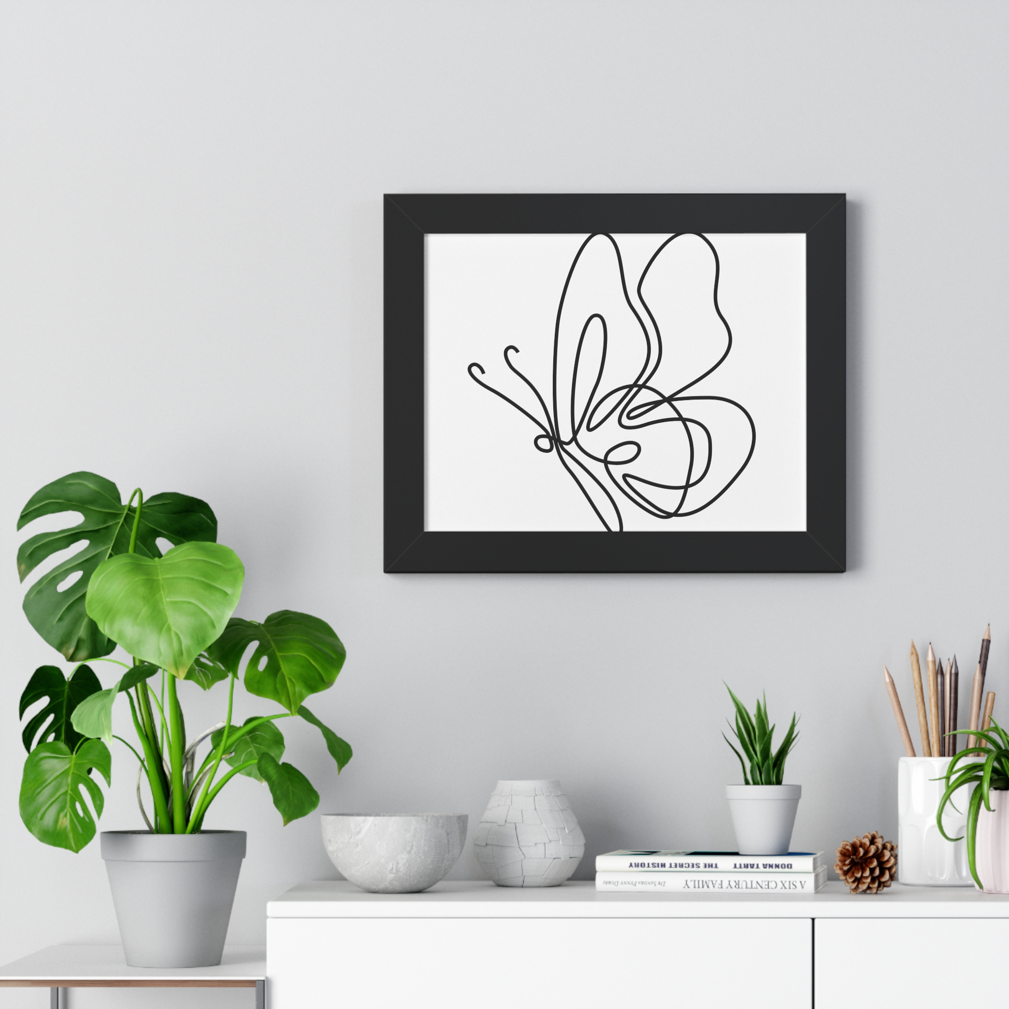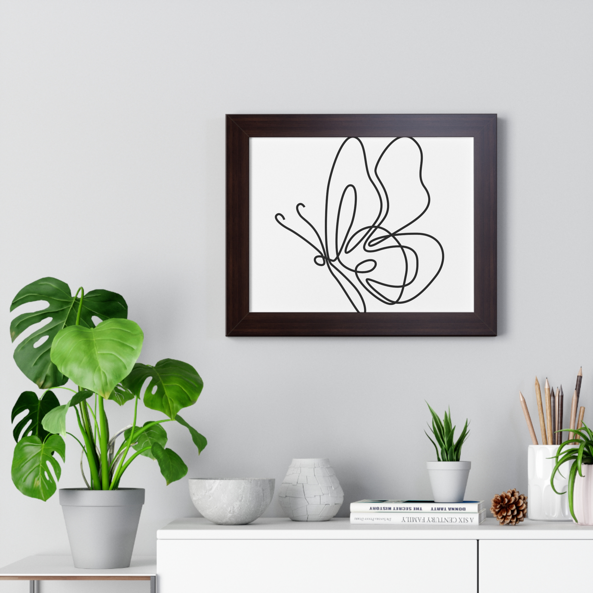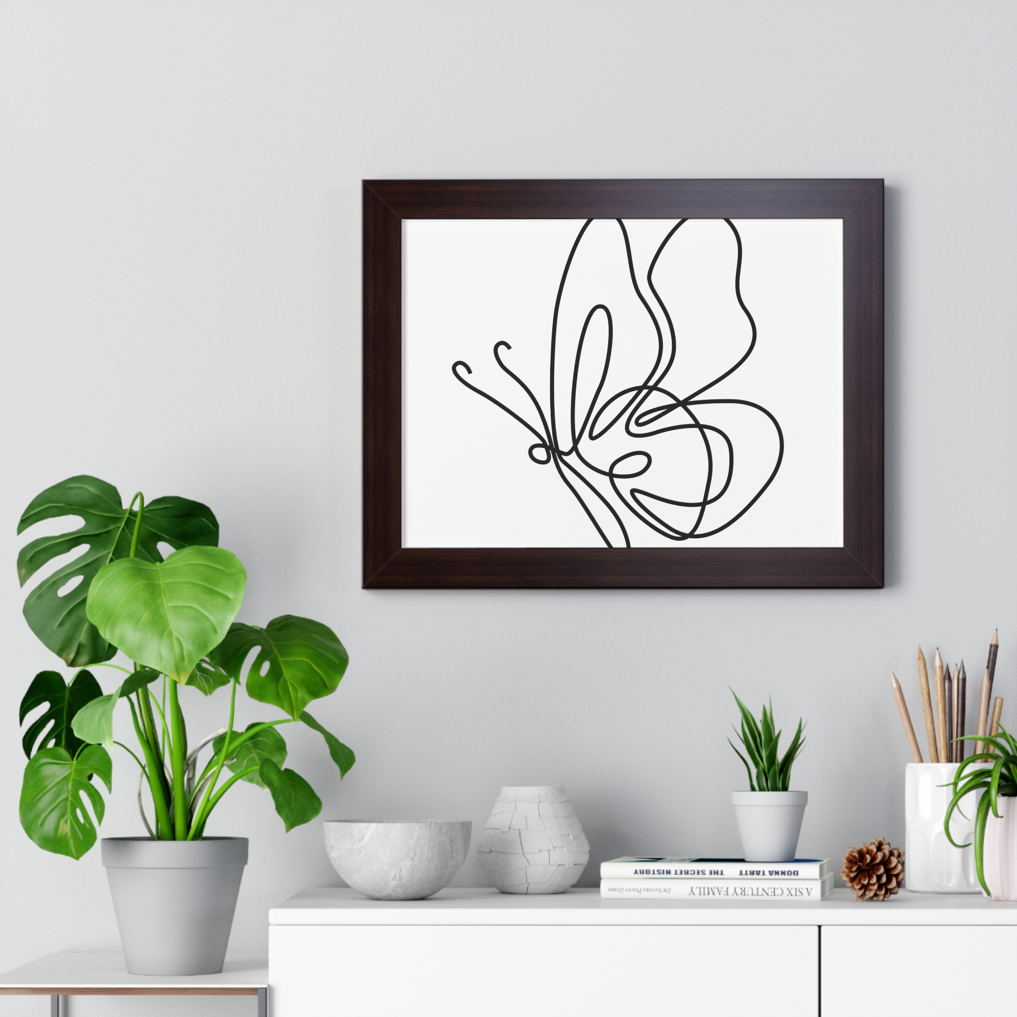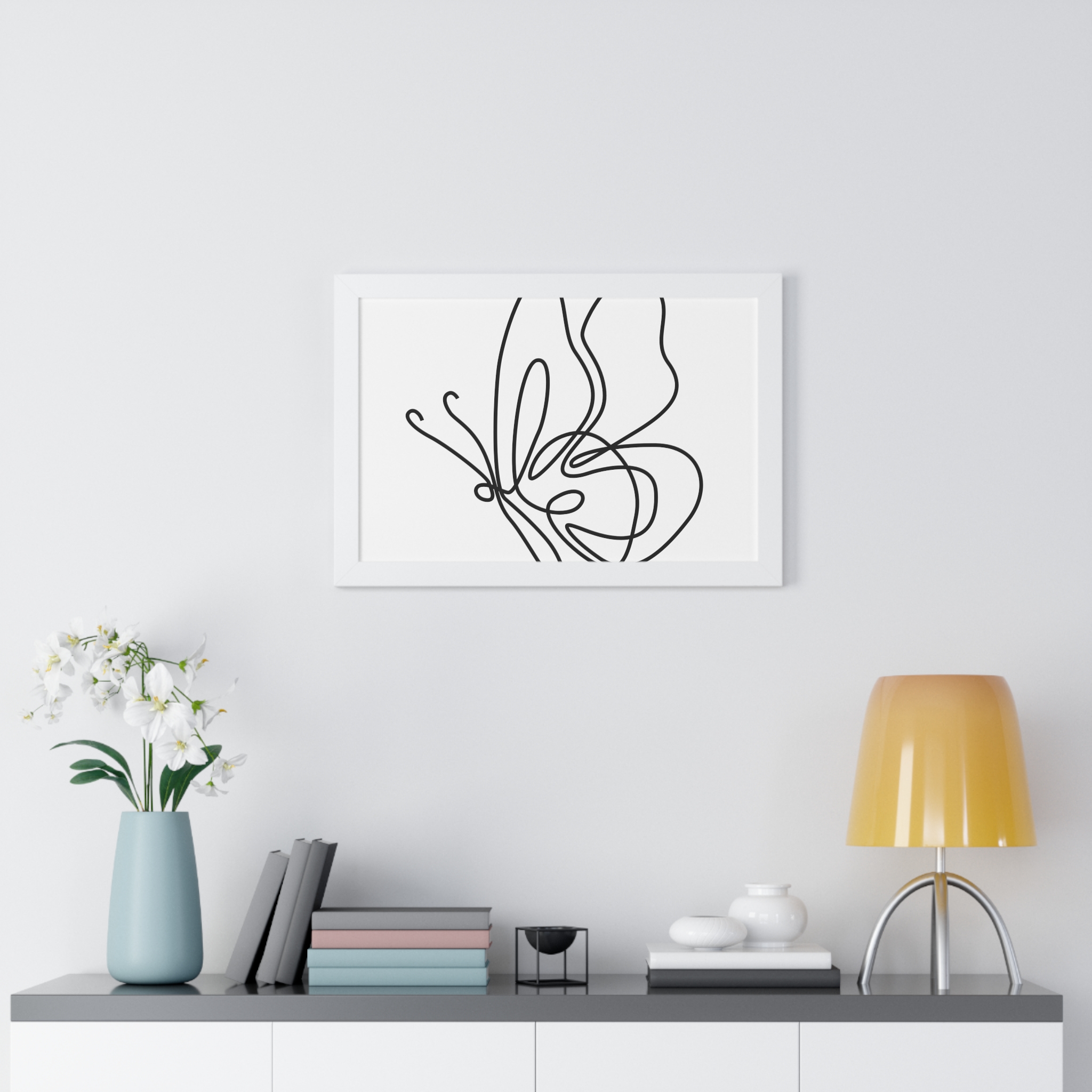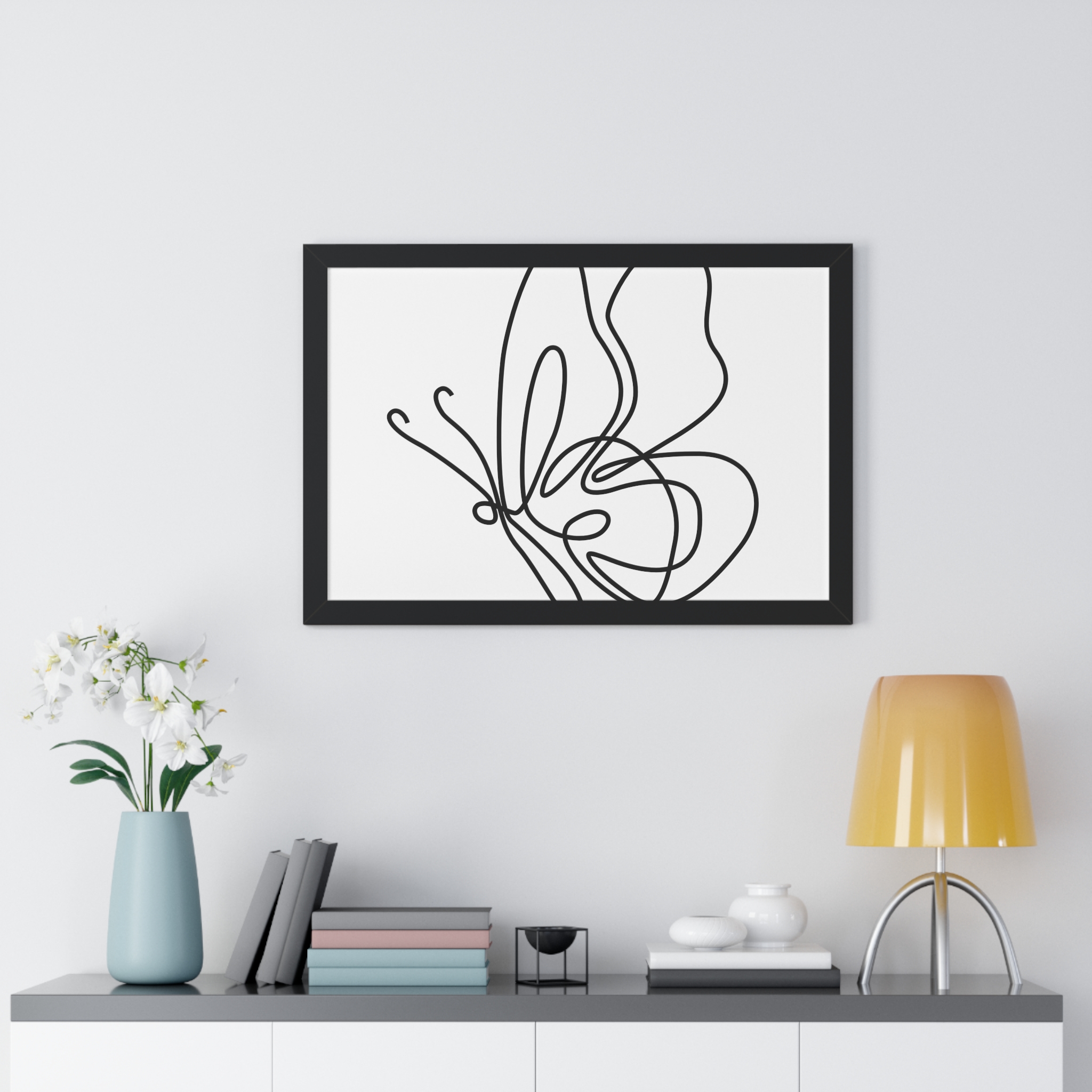 A framed horizontal poster featuring a minimalist continuous-line butterfly sketch. The clean black linework on matte museum-grade paper brings an airy, contemplative pause to any room. Housed in a slim MDF frame with a protective acrylic cover, the print arrives ready to hang with pre-installed hardware and a fixed hanging kit. Available in black, walnut, or white frame finishes, this understated piece slips easily into living rooms, entryways, or home offices — a quiet accent that complements plants, ceramics, and neutral décor while adding a touch of organic movement to the wall.