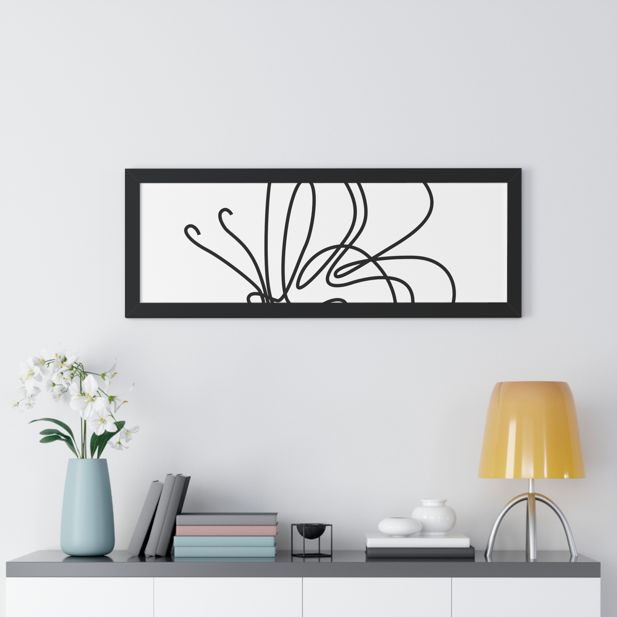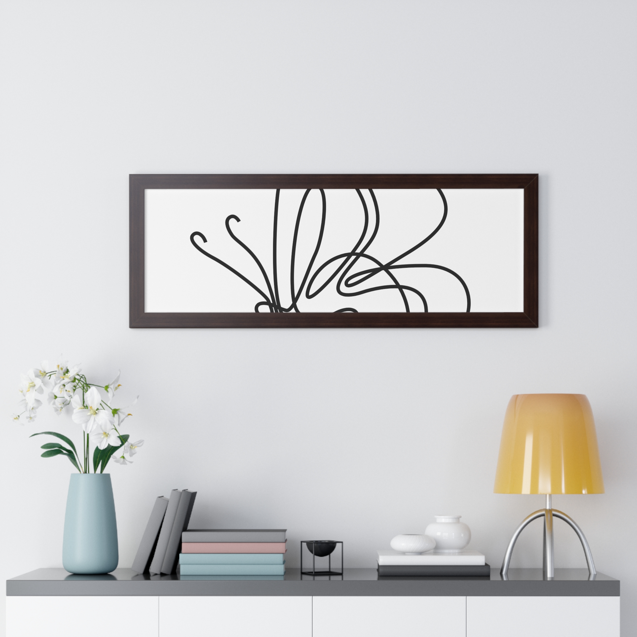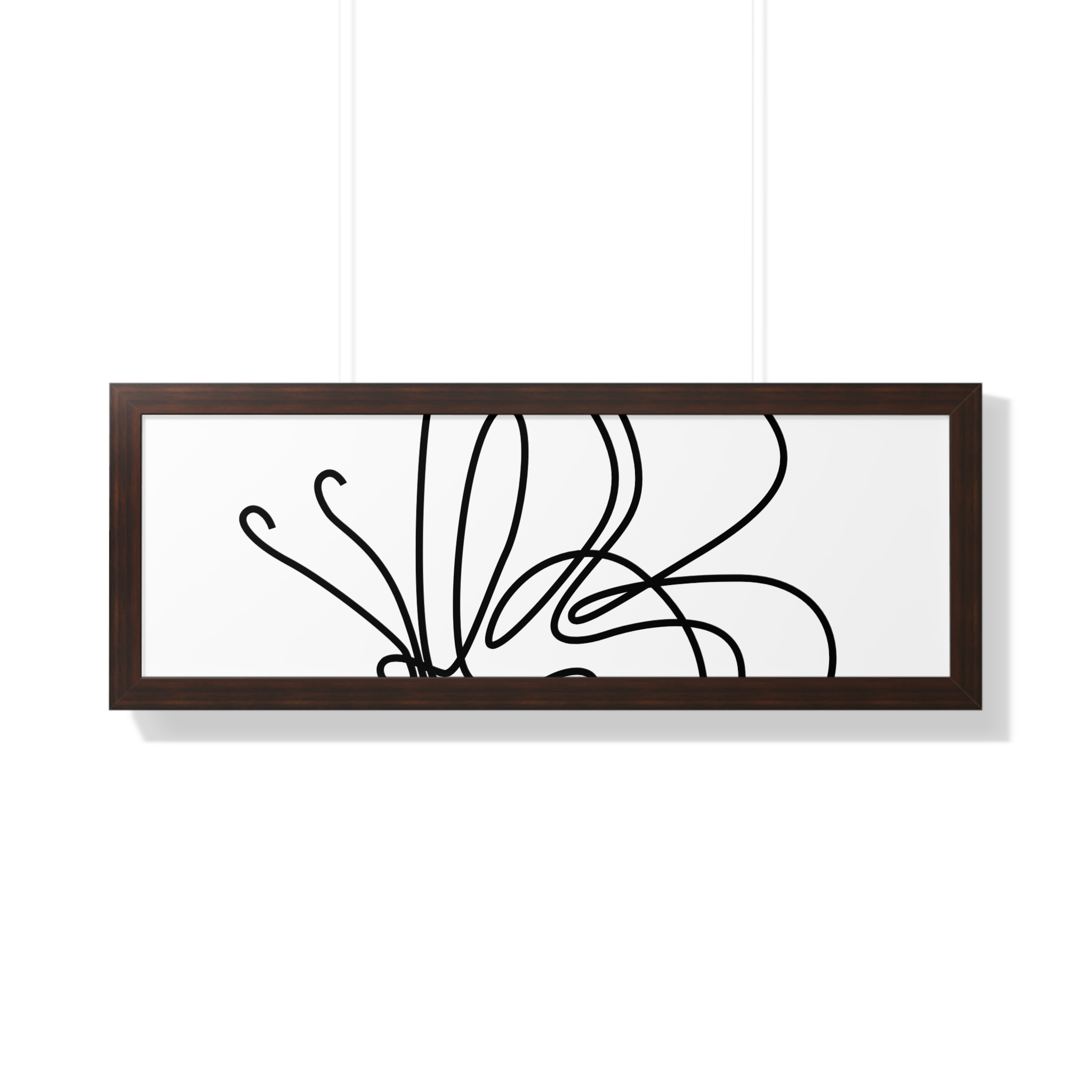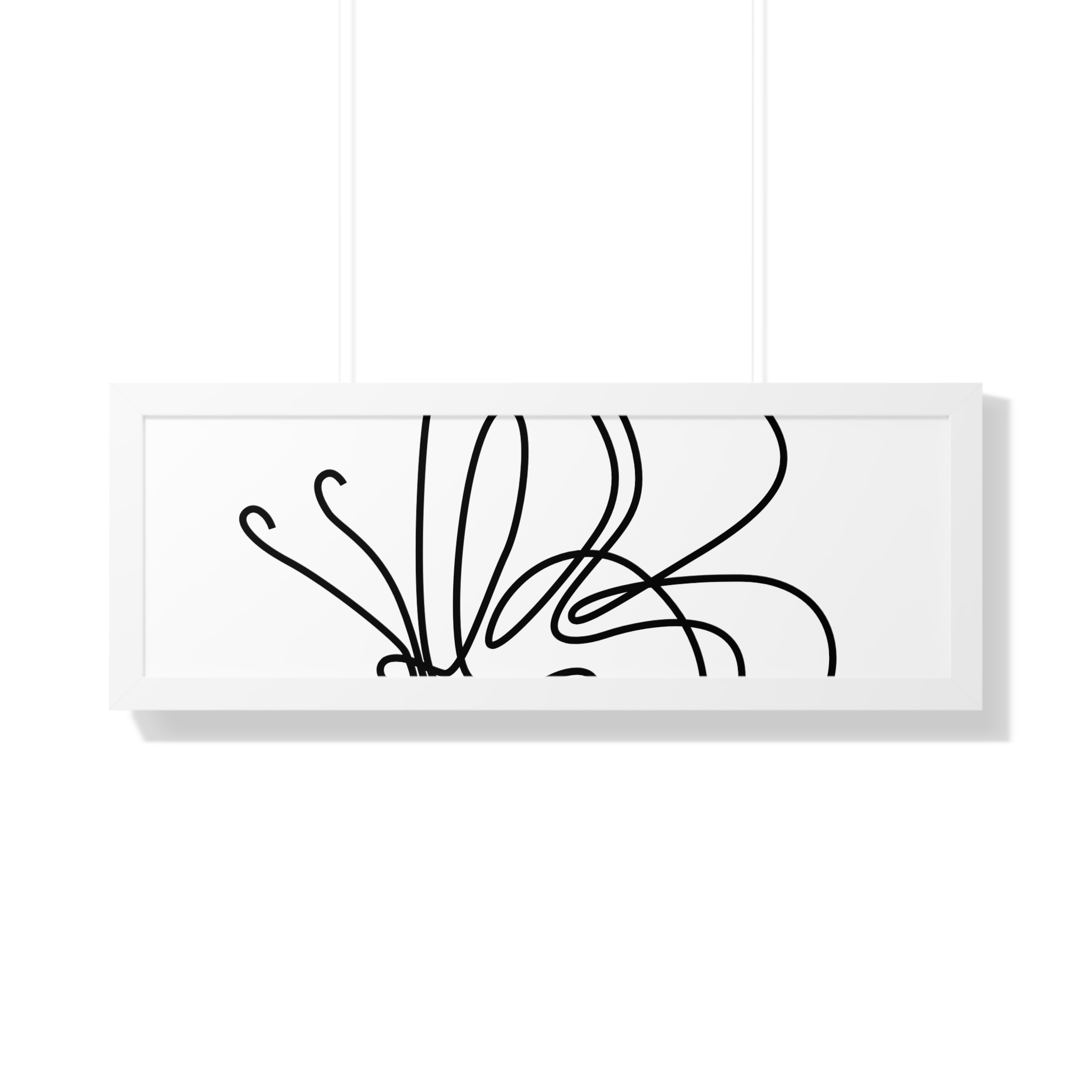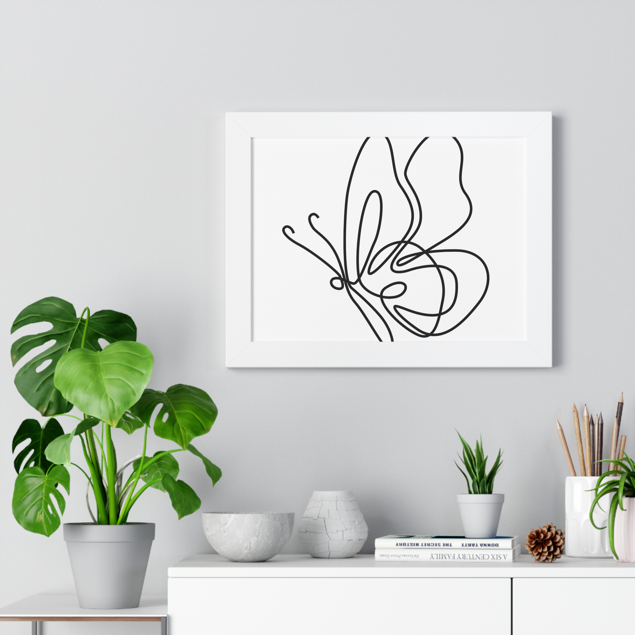 A framed horizontal poster featuring a minimalist continuous-line butterfly sketch. The clean black linework on matte museum-grade paper brings an airy, contemplative pause to any room. Housed in a slim MDF frame with a protective acrylic cover, the print arrives ready to hang with pre-installed hardware and a fixed hanging kit. Available in black, walnut, or white frame finishes, this understated piece slips easily into living rooms, entryways, or home offices — a quiet accent that complements plants, ceramics, and neutral décor while adding a touch of organic movement to the wall.