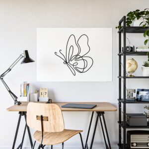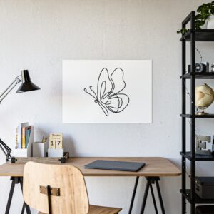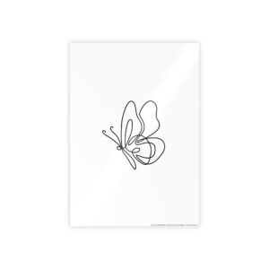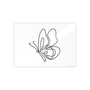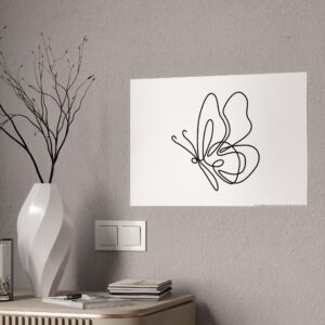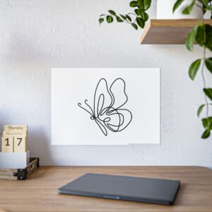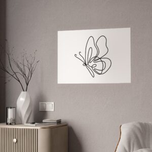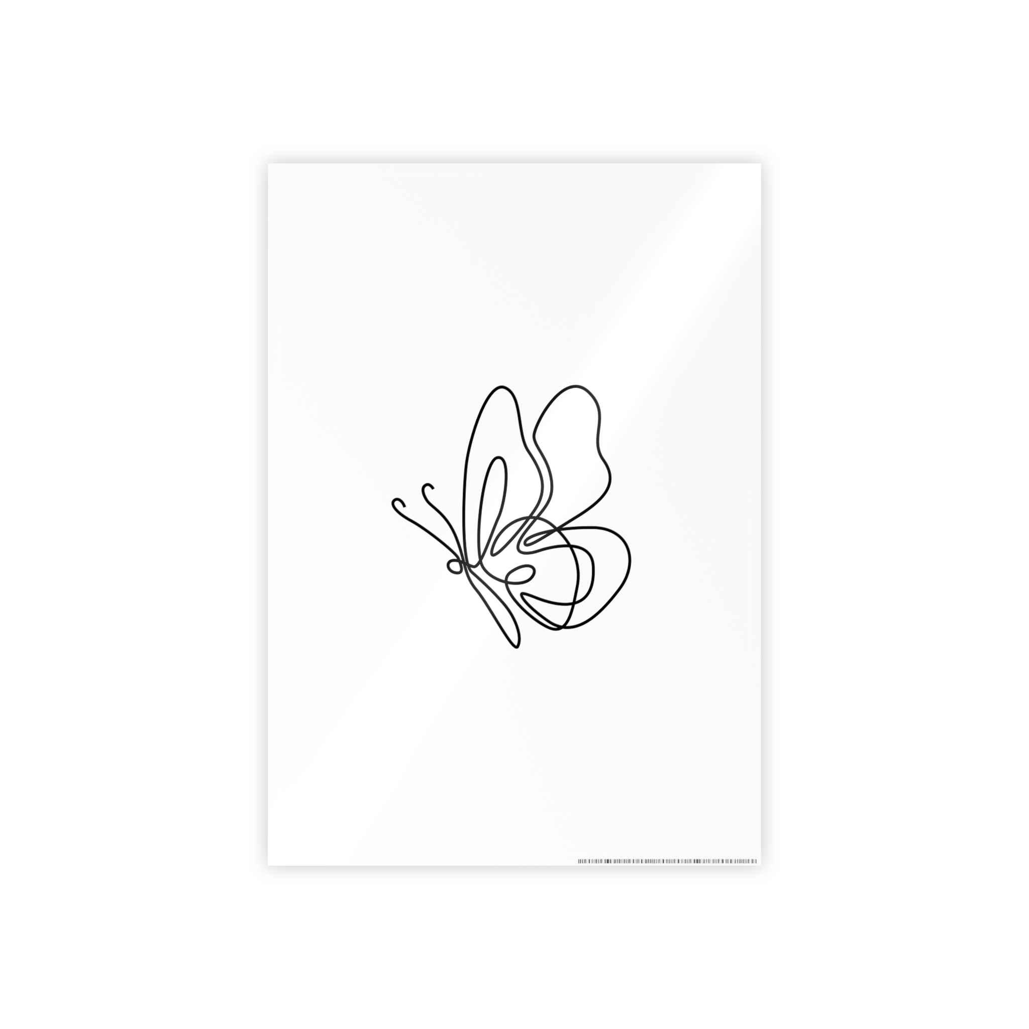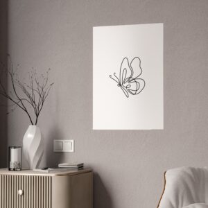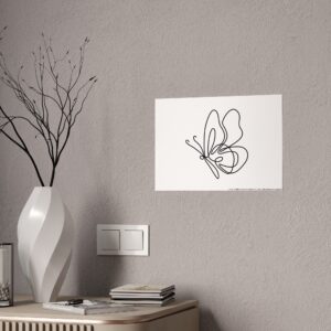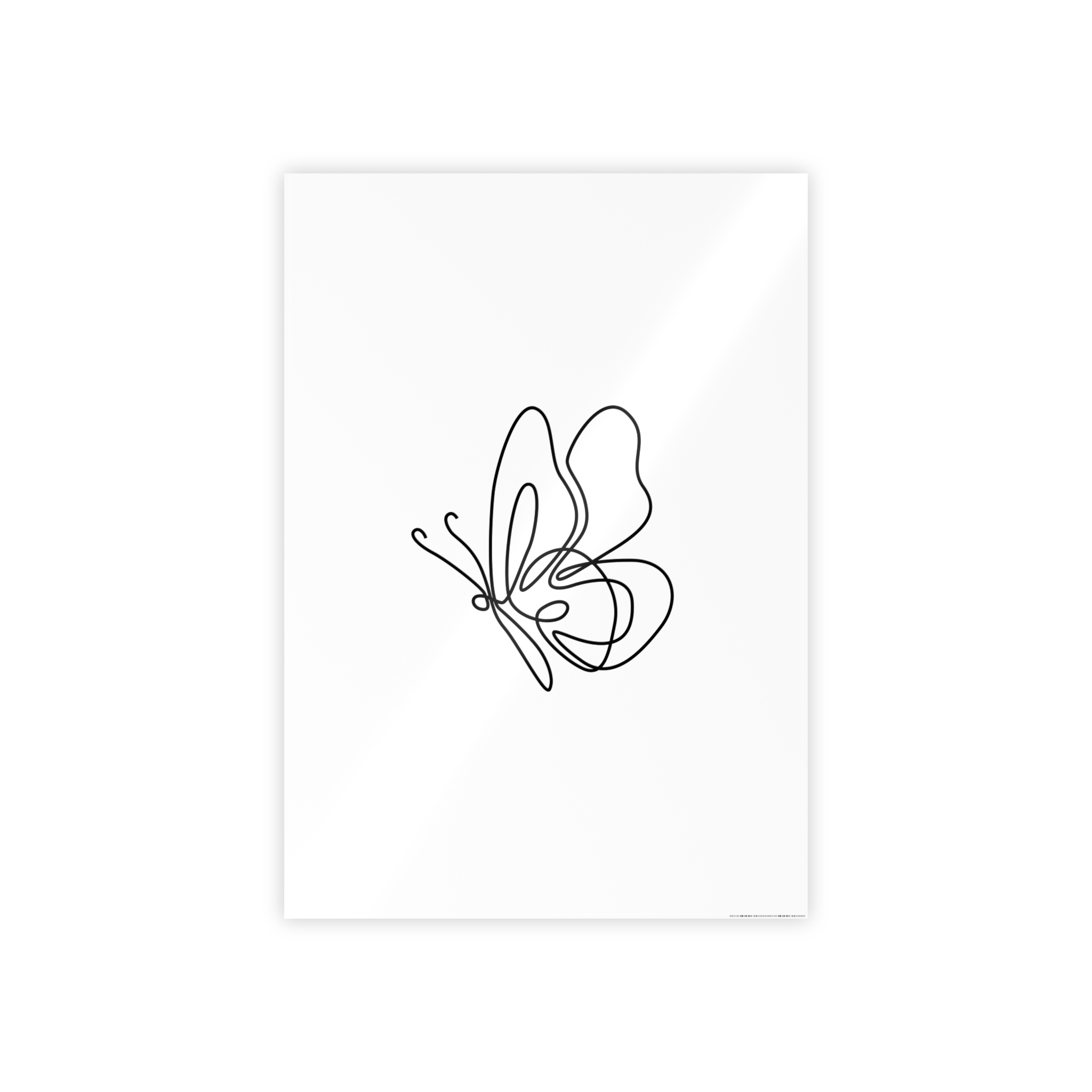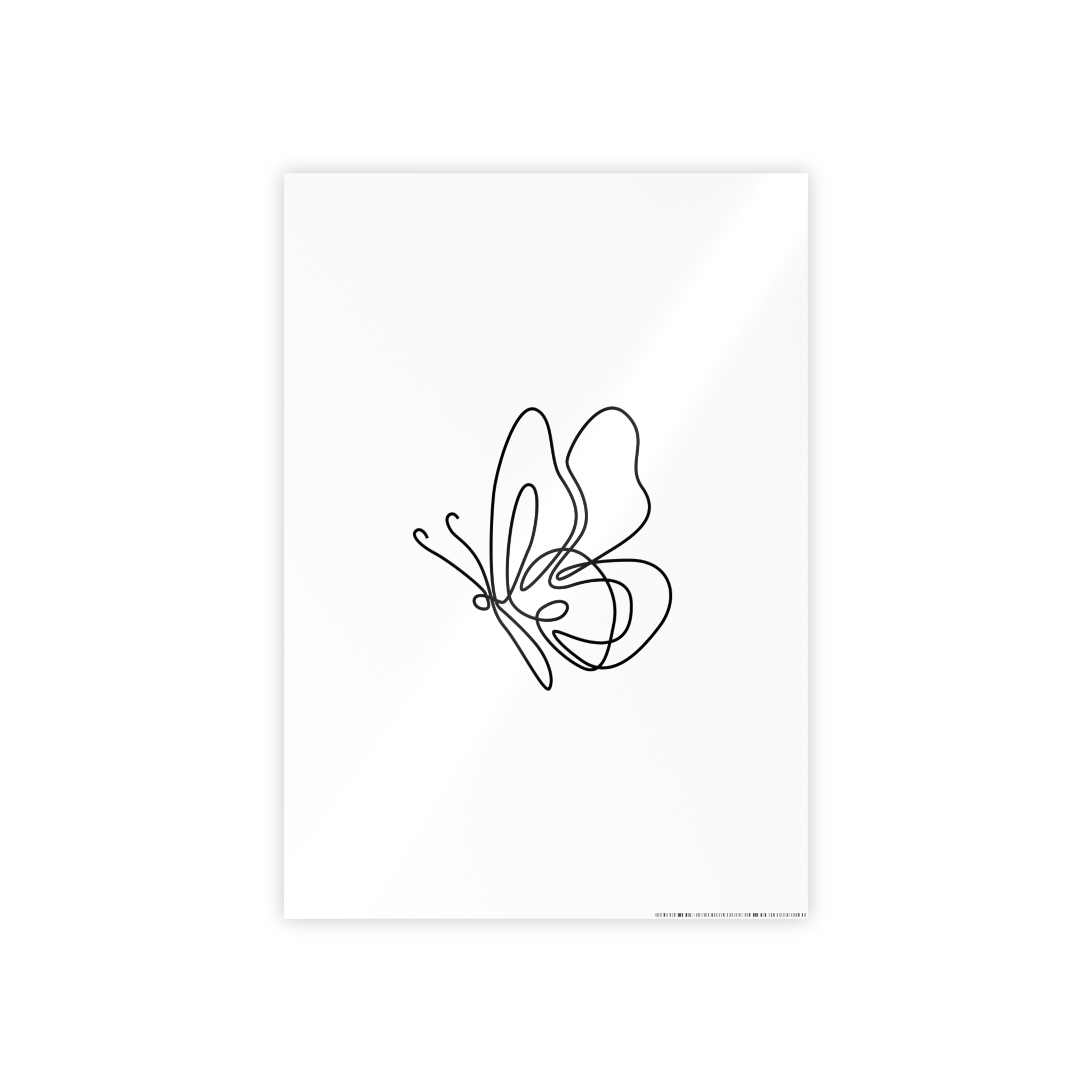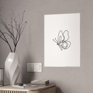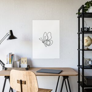 A sleek, glossy poster that brings calm and clarity to any room. This minimalist line-art butterfly floats on a crisp white field, its single continuous stroke suggesting motion, lightness, and quiet confidence. Hung above a desk, leaning on a shelf, or clustered with other small prints, it adds a modern, airy accent without shouting. The high-gloss surface gives the delicate lines a refined contrast and a subtle sheen that catches morning light, enhancing the sense of space and focus.