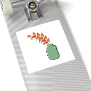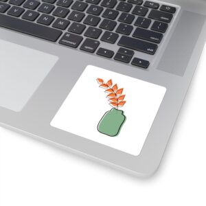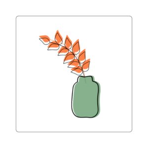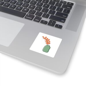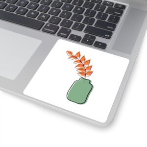 These square vinyl stickers bring a little calm, modern warmth to your everyday things. A soft green vase holds a stem of warm, terracotta leaves — simple, hand-drawn lines and a glossy finish that makes the colors pop. Stick it on a laptop corner, a sketchbook, a planner, or a mirror to add a quiet, artistic accent that reads like a small, wearable print.