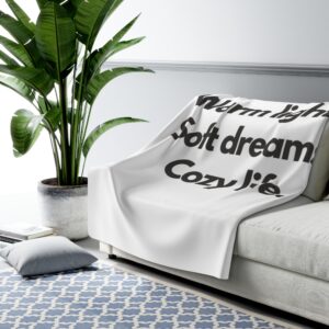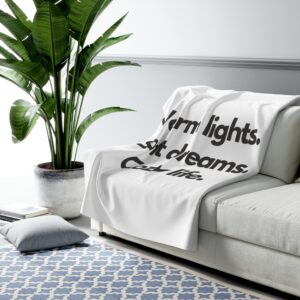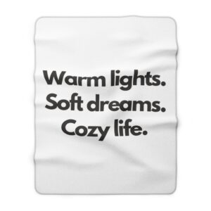 A supremely soft sherpa fleece blanket that invites slow evenings and quiet comforts. One side features bold, modern typography that reads “Warm lights. Soft dreams. Cozy life.” against a clean background; the reverse is a plush, velvety sherpa that wraps you in warmth. It’s lightweight yet insulating thanks to 3mm, 100% polyester fleece and neatly hemmed edges for long-lasting use. Available in three sizes and made to meet safety and compliance standards, this blanket layers easily on a couch or across the foot of a bed — the kind of piece that turns ordinary nights into calm, lived-in moments.