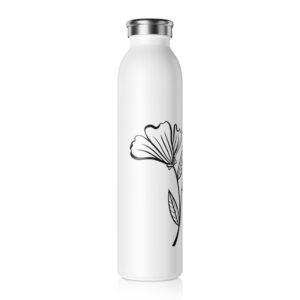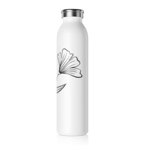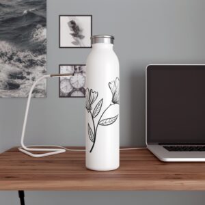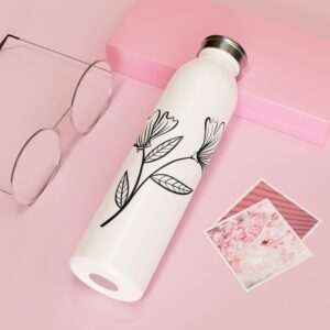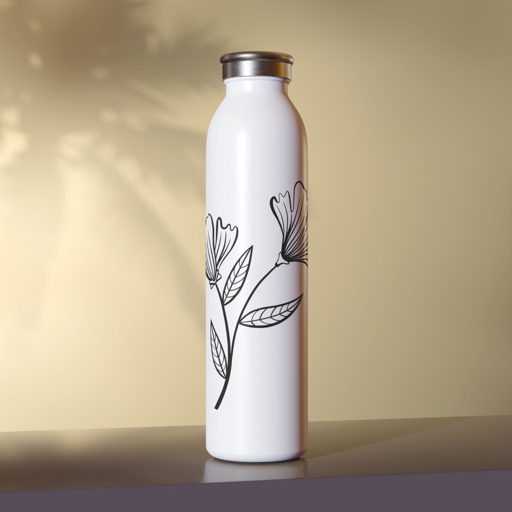 A slim, elegant stainless steel bottle that carries morning walks and desk-side sips with quiet confidence. The matte white body is stamped with a delicate black floral sketch — fine petals and slender leaves that feel handmade and personal. Because it’s vacuum-sealed and double-walled, it holds hot tea or iced water for hours without sweating or warming your hands. The glossy print detail contrasts the soft matte finish, and the silver stainless cap closes tightly for spill-free commuting. Lightweight and narrow, it slides easily into bike cages, tote pockets, or crowded cup holders so you can keep a little calm and hydration close through the day.