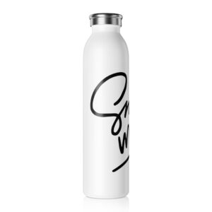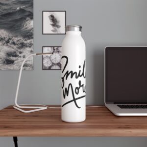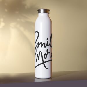 A slim, stainless steel water bottle that blends minimalist style with real everyday performance. The matte double-wall construction and vacuum seal keep drinks hot or cold for hours, while the glossy black handwritten script down the side adds a quiet, confident flourish. Lightweight and narrow, it slips into bike cages and tote pockets without fuss. Hand wash to keep that glossy print crisp and the silver cap gleaming. Bring it to morning commutes, desk days, or weekend wanderings for a small but steady reminder to sip and smile.