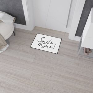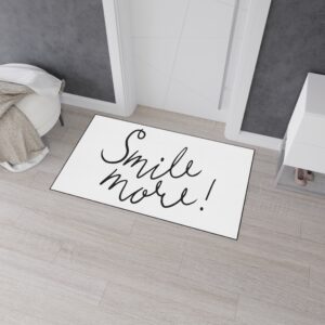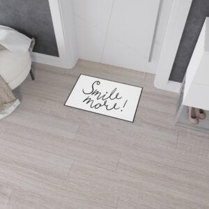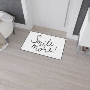 A clean, modern floor mat that brings a quiet push of positivity into everyday spaces. The white surface features a loose, hand-lettered “Smile more!” in flowing black script — casual, sincere, and easy to live with. The low-profile mat lies flat at entryways, kitchens, or in front of a sink, offering a soft place to stand while greeting guests or stealing a quick moment to breathe. The dense polyester top shows off the bold black lettering with crisp contrast, while the textured rubber backing keeps the mat anchored through daily foot traffic. Black trim frames the design, giving it a finished, gallery-like edge that complements both minimal and cozy interiors. Built to resist wear and assembled in the USA from globally sourced parts, this mat looks fresh and holds up where it counts.