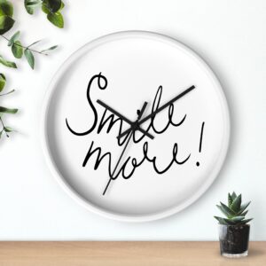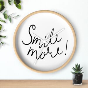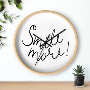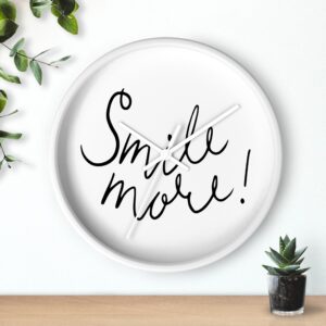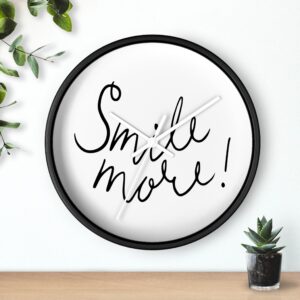 This wall clock brings calm, handwritten charm to any room. The loose, flowing script reads like a quick, encouraging note scrawled on a kitchen cabinet or studio wall — a small, quiet reminder to breathe and smile. With a slim black frame and clear plexiglass face, the design stays visually light while the silent mechanism keeps rooms peaceful. Hang it above a work desk, in a morning nook, or near an entryway where it catches the eye and softens the moment.
