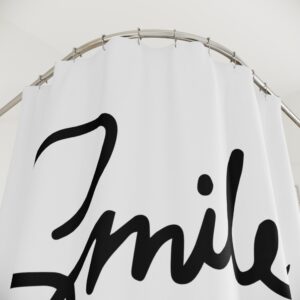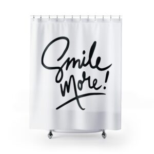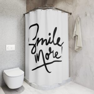 Bring a burst of handwritten warmth into your bathroom with this bold, monochrome shower curtain. The one-sided print features energetic brush-lettering that reads “Smile more!”—a casual, uplifting reminder to start each day lighter. The crisp black on white layout keeps things modern and minimal, while the oversized script becomes a focal point without cluttering the space. It hangs neatly from 12 reinforced buttonholes and dries quickly thanks to the sturdy polyester fabric. Swap it in for a quick refresh when you want your morning routine to feel friendlier and more intentional.