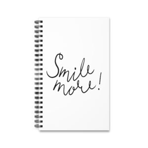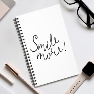 This spiral journal carries a calm, handwritten charm — a slim companion for daily thoughts, lists, doodles, and plans. The soft white cover features a playful, hand-lettered “Smile more!” that nudges you to pause and notice small joys. Inside, 160 pages of lined 90gsm paper accept fountain pens, everyday ballpoints, and quick sketches without bleeding through. The semi-gloss laminated front keeps the cover crisp and protected, while the sturdy black back and spiral binding make flipping pages effortless. It sits neatly in a tote or on a bedside table, ready when you need to capture a bright idea, a gratitude note, or a moment of calm.