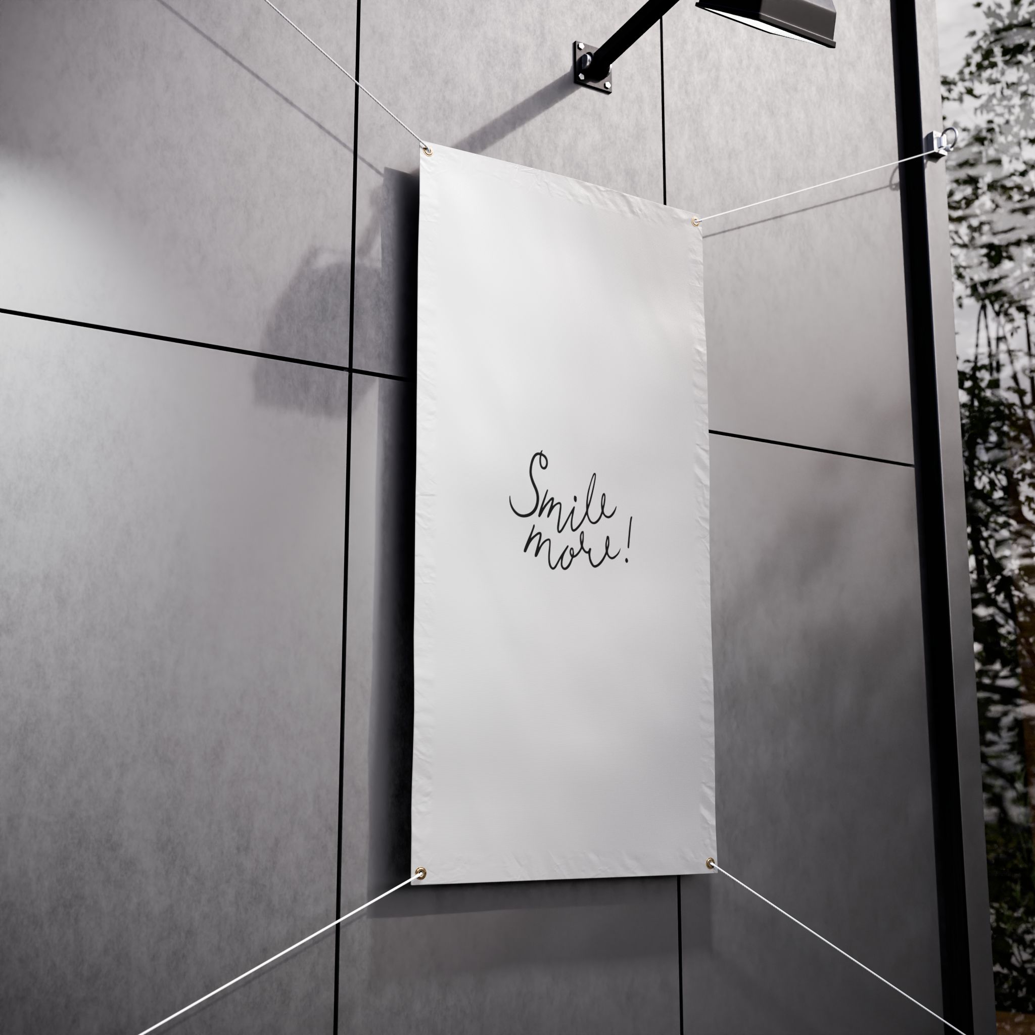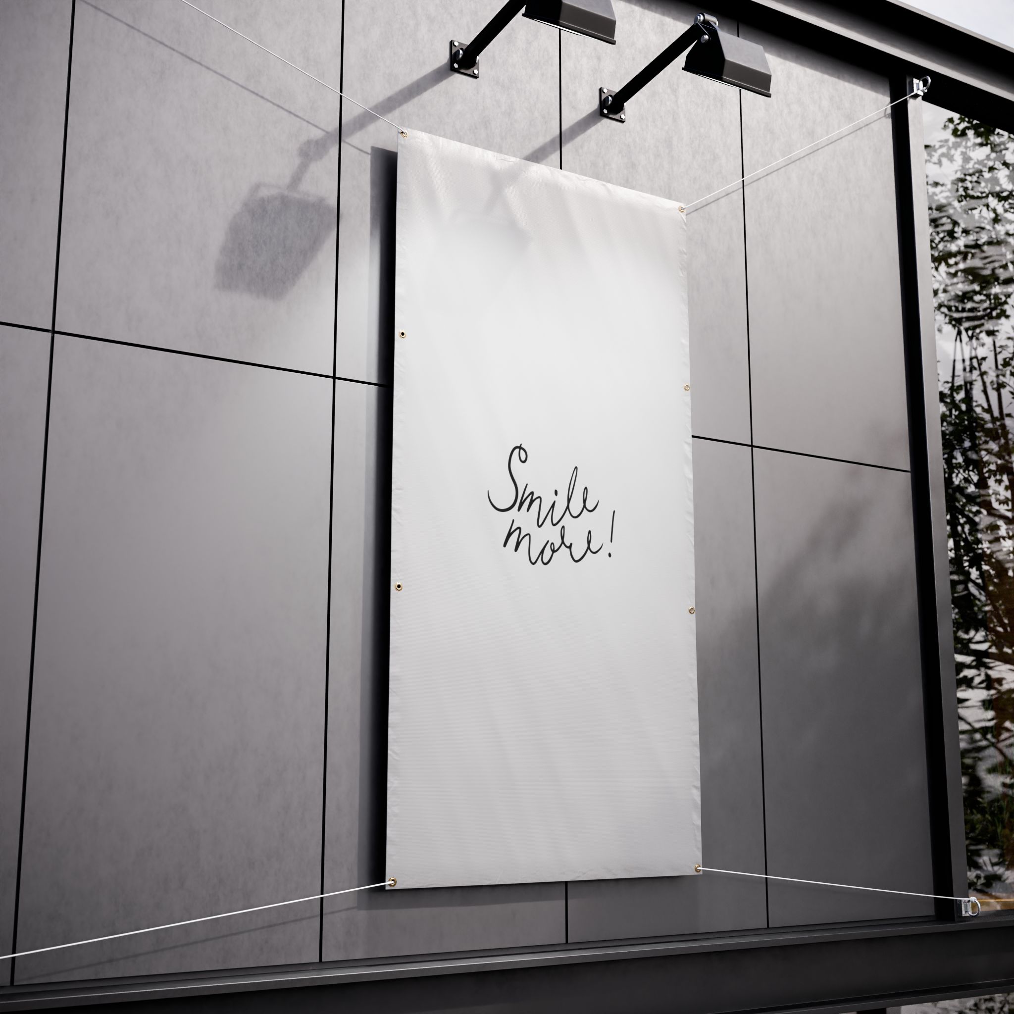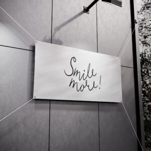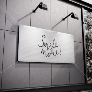 A sturdy, weather-ready vinyl banner that speaks with simple charm. Lightweight yet durable Titan™ 10 oz scrim vinyl holds a clean white field where expressive, hand-lettered black script reads “Smile more!” — a gentle prompt that brightens fences, storefronts, event booths, or backyard gatherings. Reinforced, heat-welded hems and metal grommets at the corners make hanging straightforward and secure (hanging cords not included). The printing produces crisp, bold contrast so the message stays visible from a distance, while the material stands up to sun and rain for repeated outdoor use. This banner fits into both everyday street-side displays and curated event setups, adding an approachable, human touch that invites a pause and a grin.