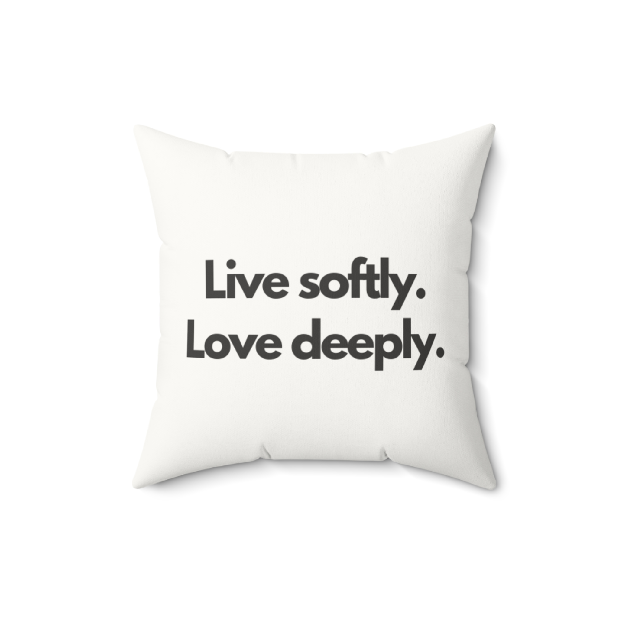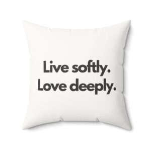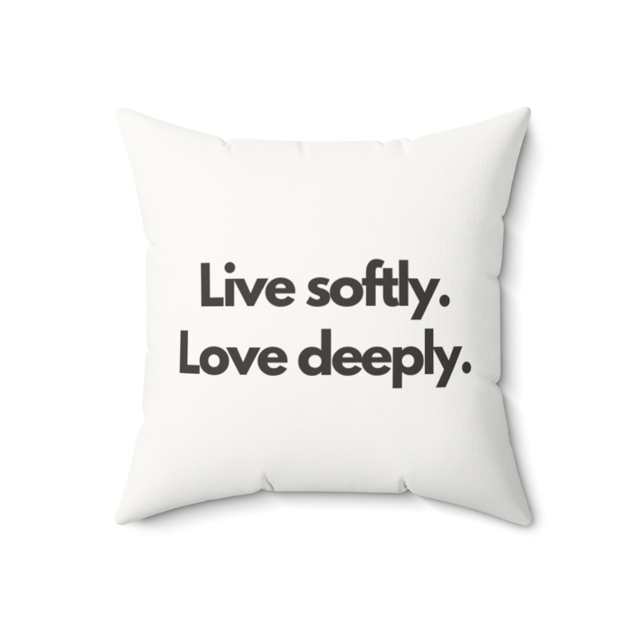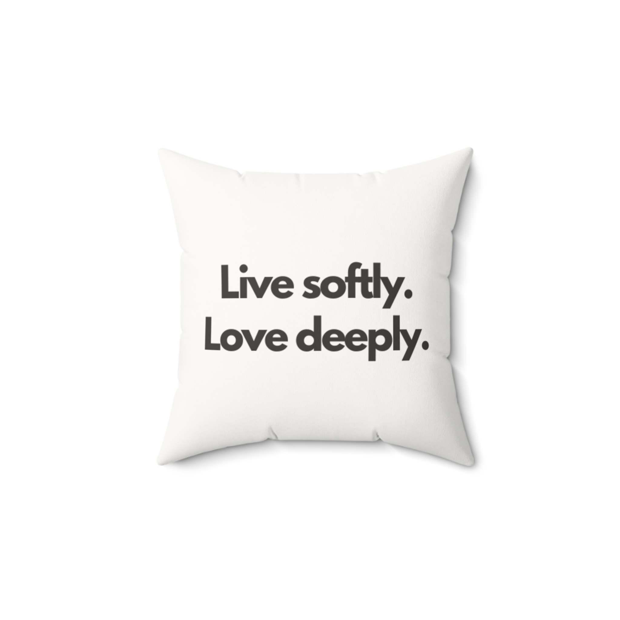 Soft, simple, and quietly joyful — this faux suede square pillow brings calm and gentle charm to any room. The double-sided design pairs a minimalist line-art cherry with the soothing phrase “Live softly. Love deeply.” rendered in a warm, modern type. The suede-like cover feels velvety to the touch while the recycled-poly insert adds plush, long-lasting loft. Neutral tones and a concealed beige zipper keep the look clean and versatile, so it slips effortlessly onto a couch, reading nook, or bedroom chair to create a peaceful, personal corner.
