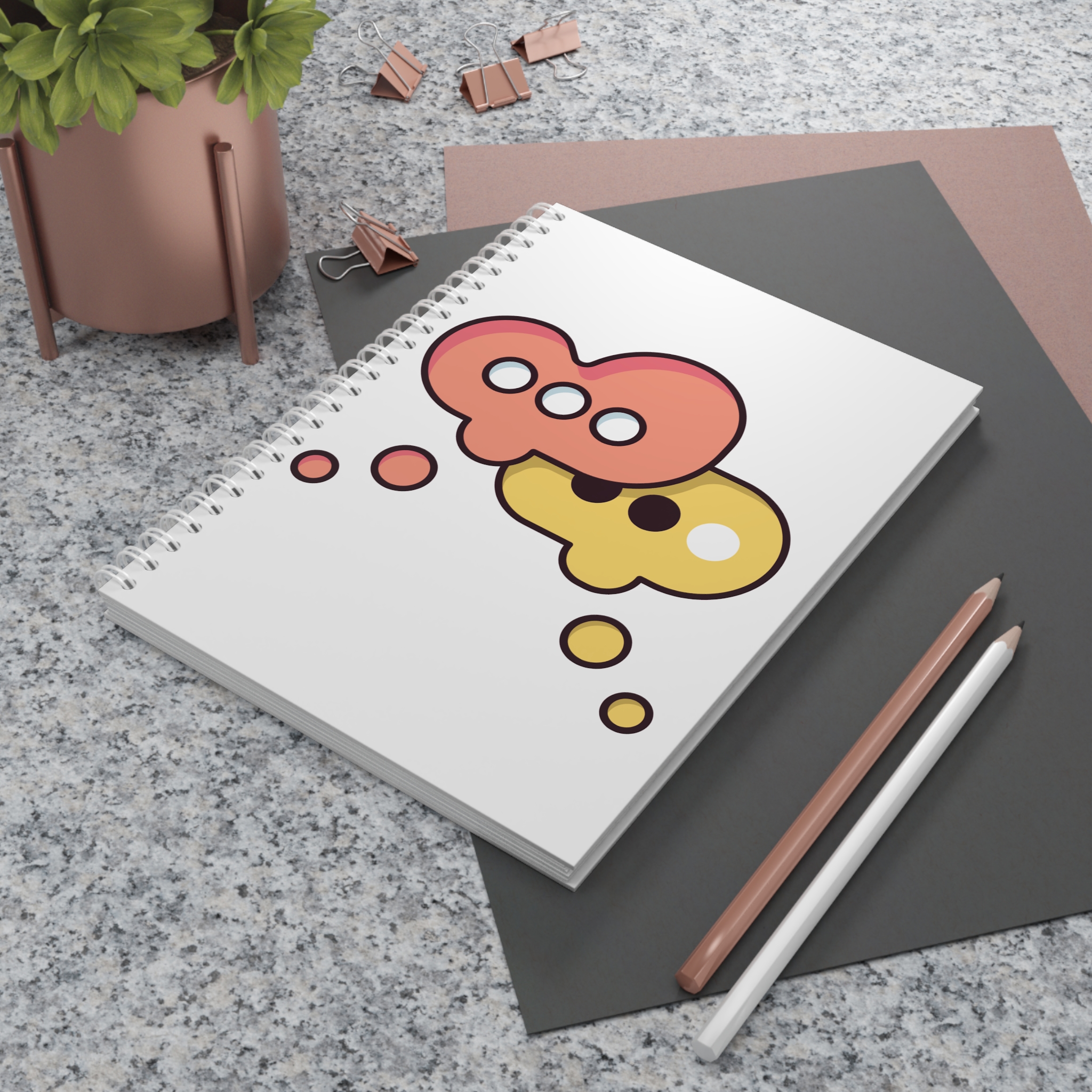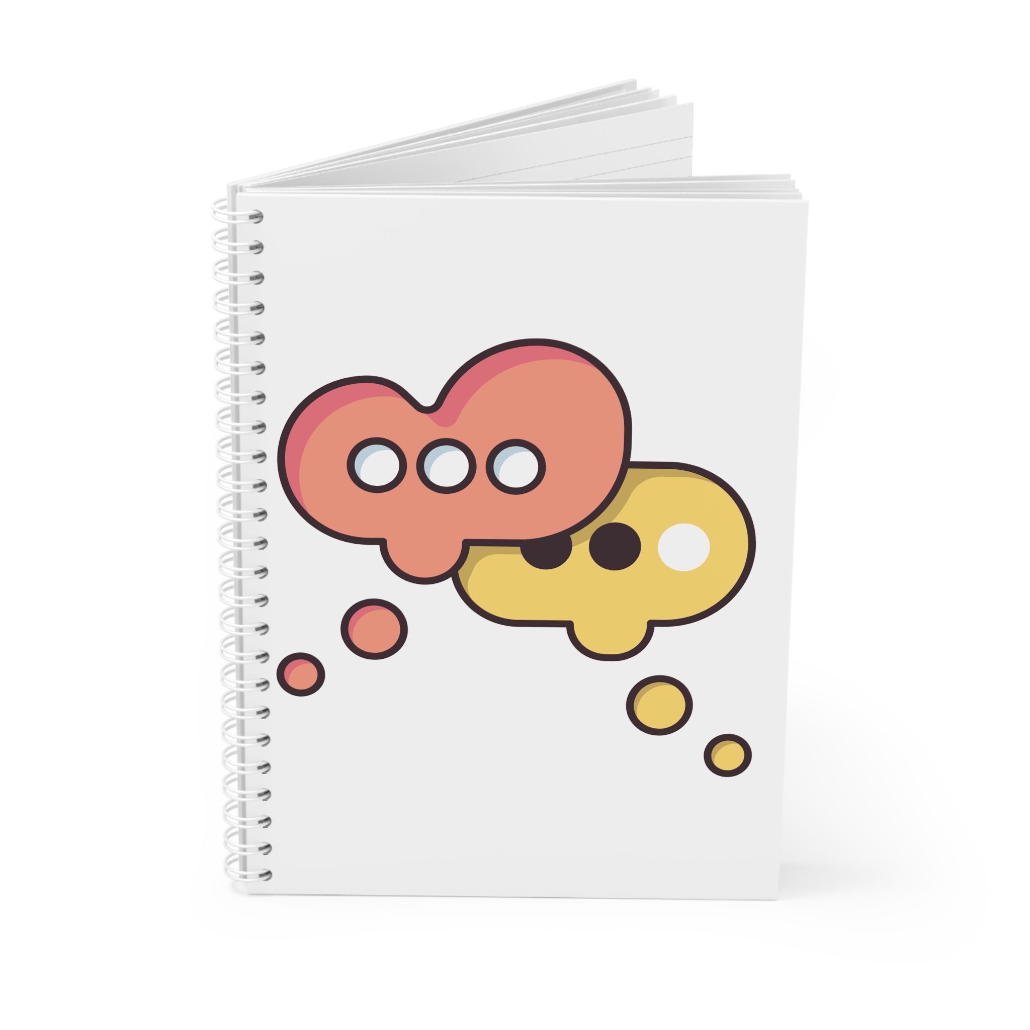 A bright, playful spiral notebook that invites ideas to bubble up. The semi-gloss cover showcases a duo of whimsical chat-bubble shapes in warm coral and sunny yellow — simple, modern art that sparks conversation. Inside, 128 ruled pages of smooth 90gsm paper give your handwriting room to breathe, while the white metal spiral lays flat for comfortable note-taking and lets you remove pages cleanly. Bring it to coffee-shop planning sessions, creative workshops, or keep it on your desk as a cheerful home for lists, sketches, and stray thoughts.
