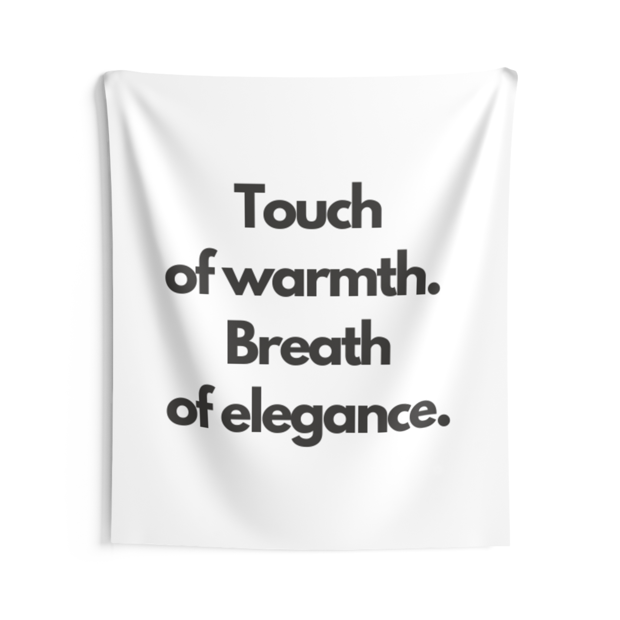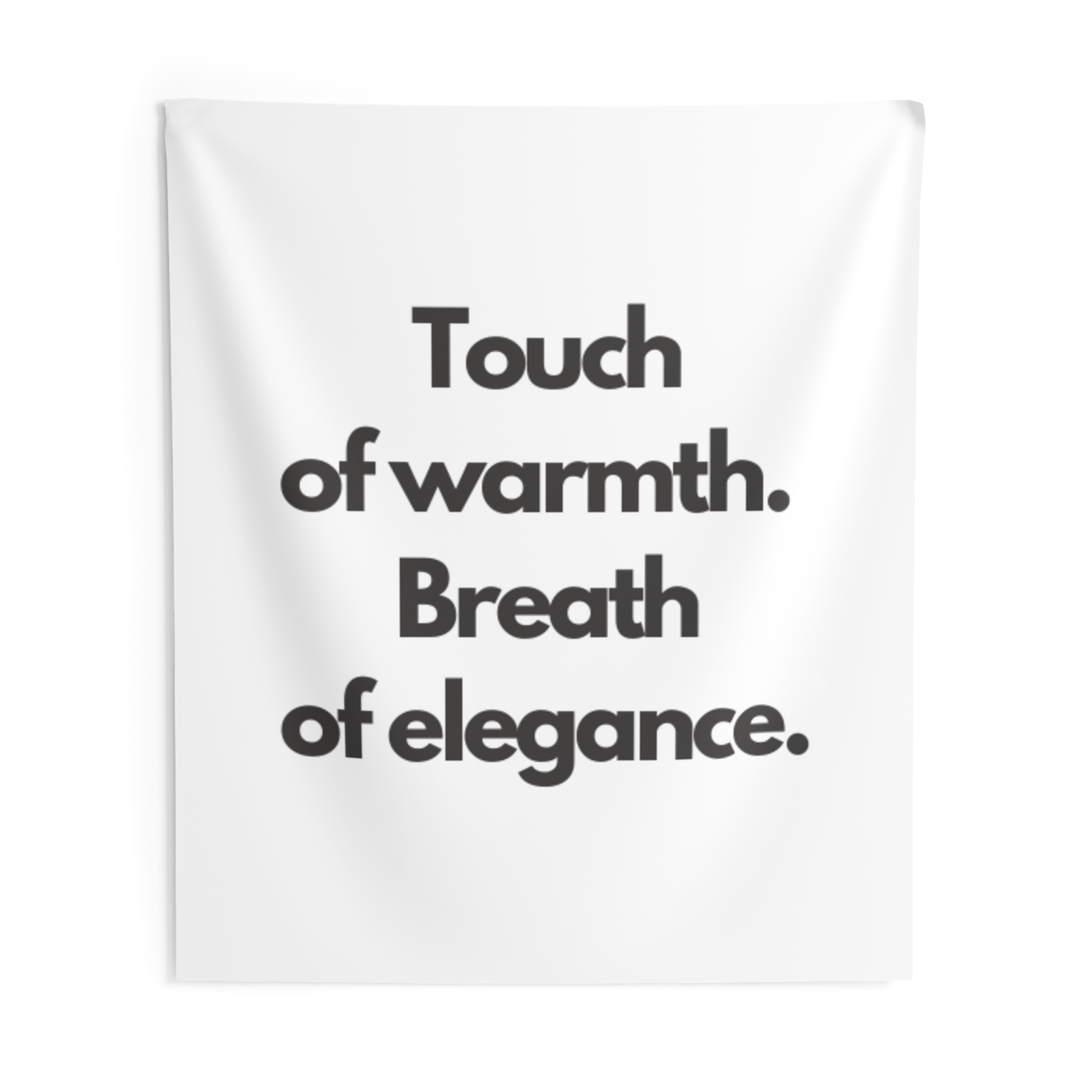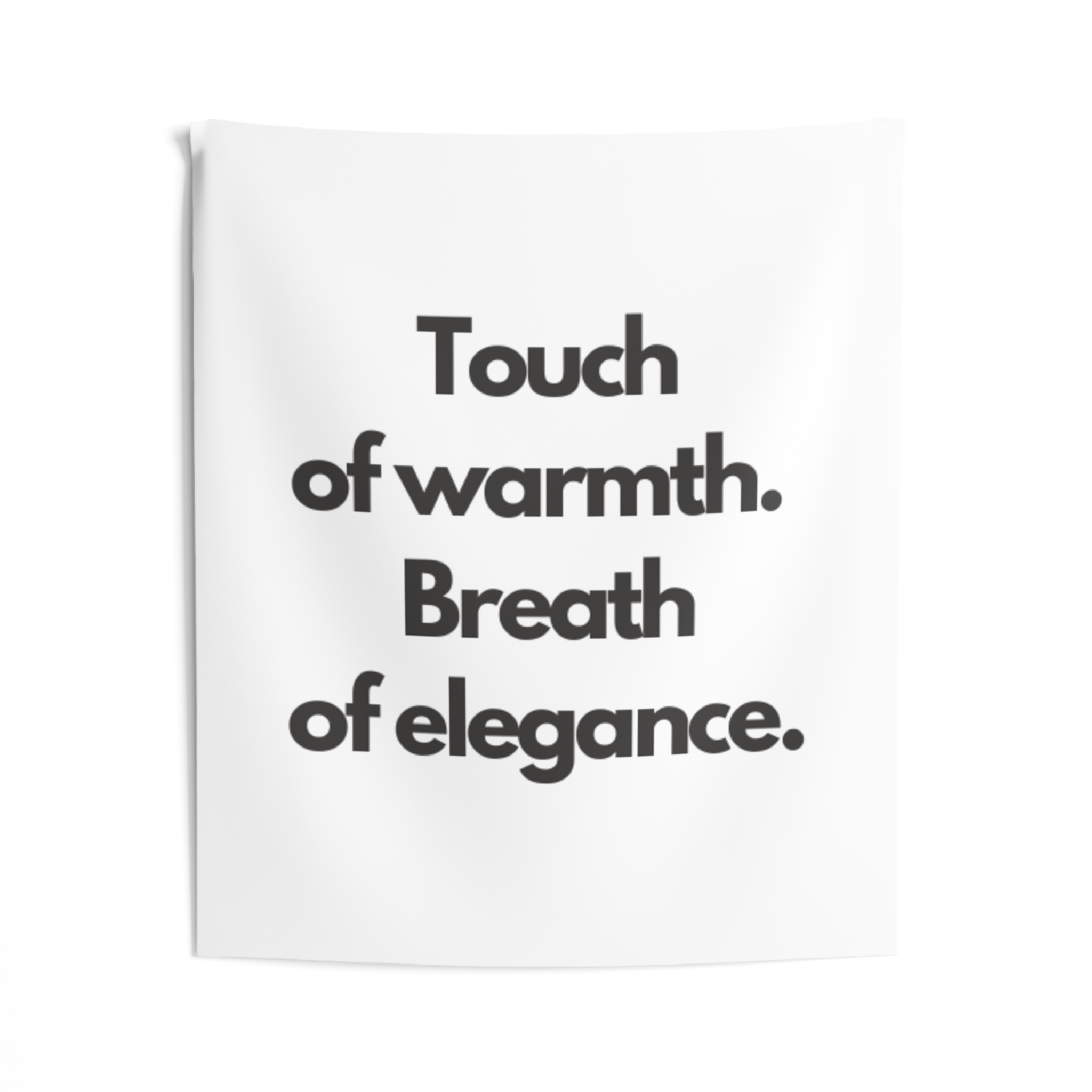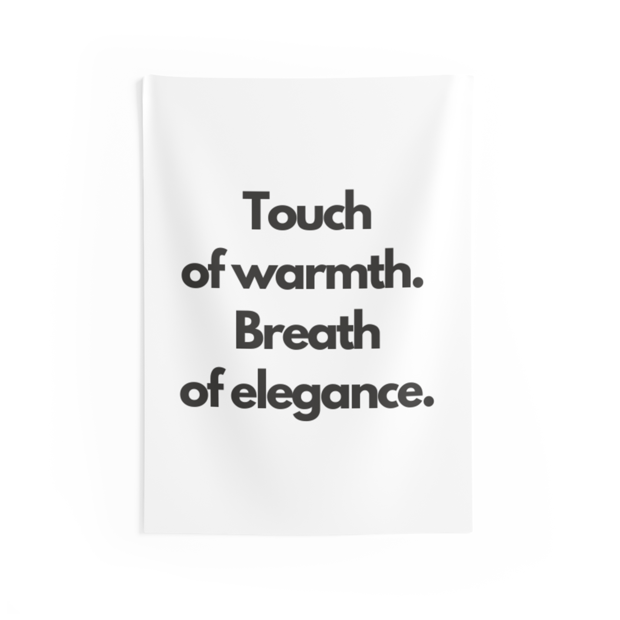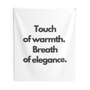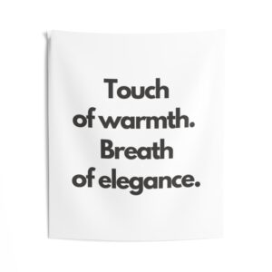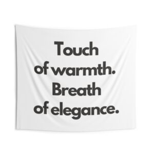 A minimalist indoor wall tapestry that speaks with quiet confidence. Clean white polyester carries bold, black serif text: “Touch of warmth. Breath of elegance.” The composition brings a gallery-ready calm to bedrooms, living rooms, or reading nooks — a gentle statement piece that layers easily with woven throws, plants, and soft lighting. It hangs smoothly from hemmed edges and keeps its shape and brightness through everyday use, creating a cozy, refined atmosphere for people who favor simple, modern interiors and thoughtful moments of pause.