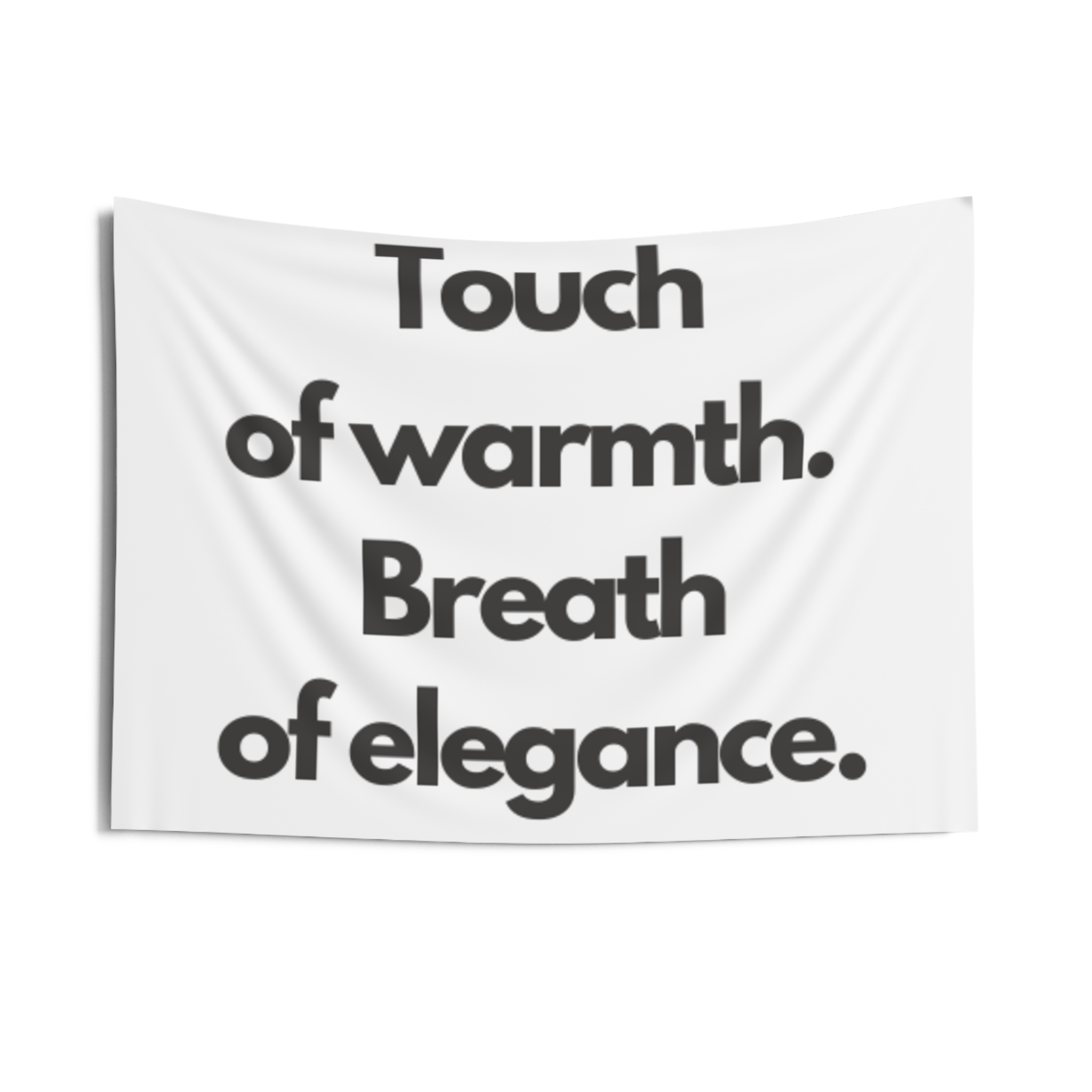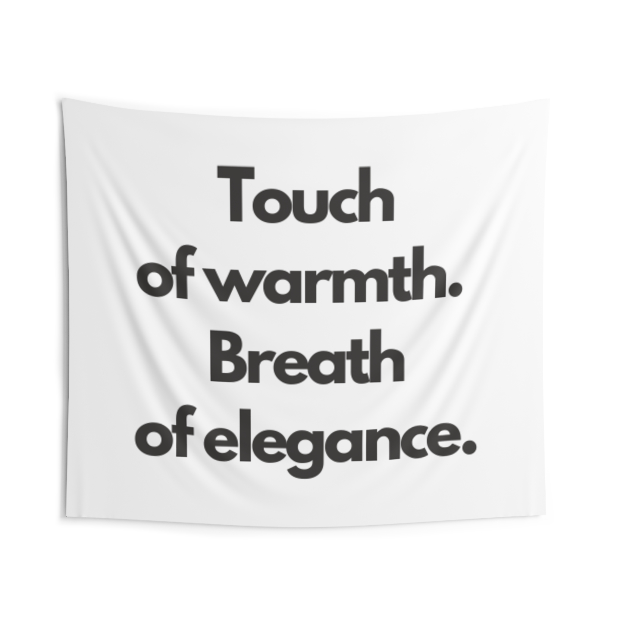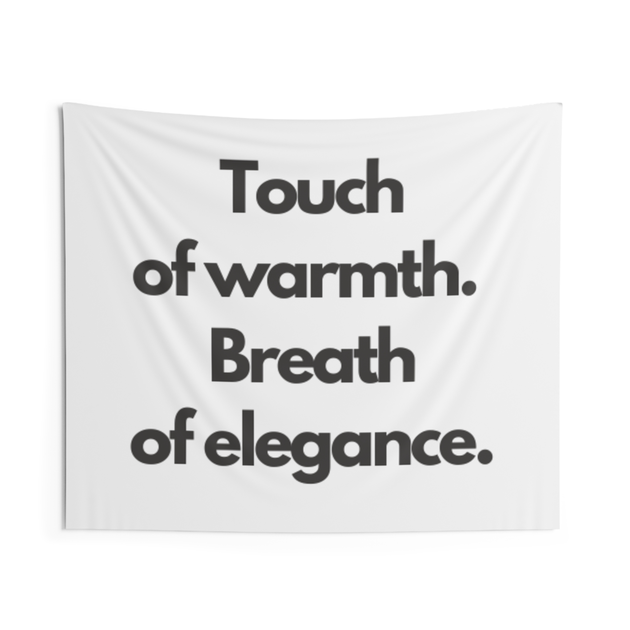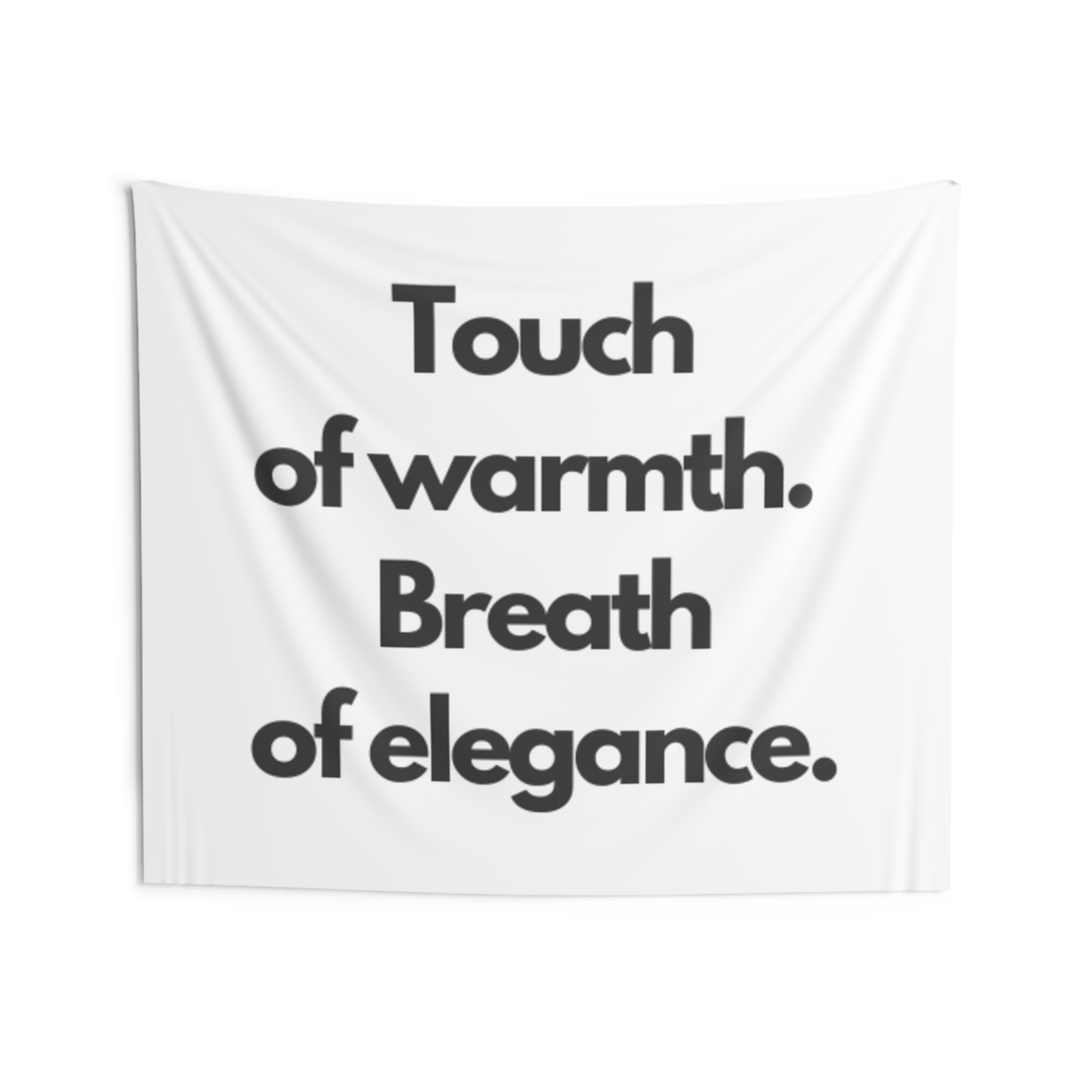 A minimalist indoor wall tapestry that speaks with quiet confidence. Clean white polyester carries bold, black serif text: “Touch of warmth. Breath of elegance.” The composition brings a gallery-ready calm to bedrooms, living rooms, or reading nooks — a gentle statement piece that layers easily with woven throws, plants, and soft lighting. It hangs smoothly from hemmed edges and keeps its shape and brightness through everyday use, creating a cozy, refined atmosphere for people who favor simple, modern interiors and thoughtful moments of pause.
