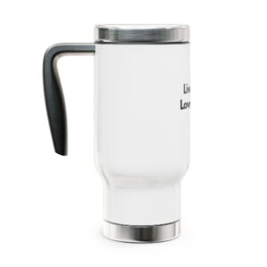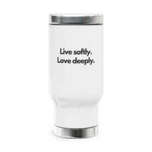 This 14 oz stainless steel travel mug holds your morning coffee or evening tea with quiet confidence. Its glossy white enamel wrap showcases minimalist text art — calm, clear, and steady — while the insulated plastic liner helps drinks stay at a comfortable temperature during commutes, walks, or desk hours. A spill-resistant snap-on cap with a removable silicone loop and a screw-on bottom make it easy to take on the go. The comfortable handle gives secure grip whether you’re navigating crowded streets or settling into a favorite reading nook. Hand wash recommended; BPA-free construction keeps every sip clean and simple.