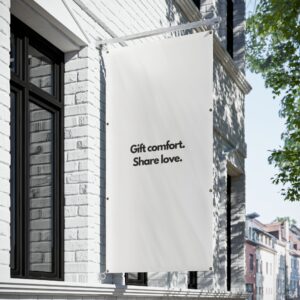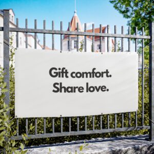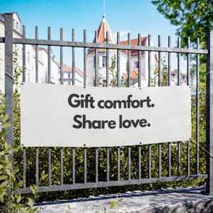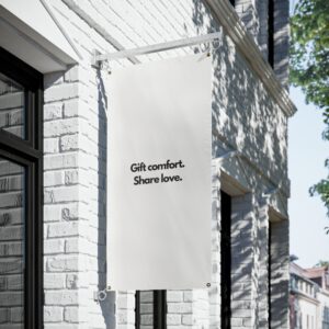 A sturdy, weather-ready banner made to carry a clear, compassionate message. This vinyl banner hangs confidently outdoors or indoors, its bold text cutting through wind and distance to share warmth: “Gift comfort. Share love.” Lightweight enough to transport, tough enough to withstand rain and sun. Use it to announce a community drive, mark a cozy shopfront, or make a quiet statement outside a gathering. The matte white backdrop keeps the message readable from afar while the robust hemmed edges and reinforced grommets hold steady on fences, railings, or display frames. It feels practical, calm, and intentional—designed for people who want their values to be visible without shouting.