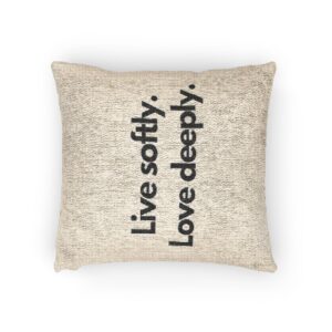 A woven decorative pillow with a calm, minimalist message woven right into the fabric: “Live softly. Love deeply.” The neutral, natural-toned weave and subtle black lettering create a quiet, tactile accent that settles easily into a bedroom, reading nook, or living room. The textured threads give the text a handcrafted, linen-like feel while the durable polyester-cotton blend keeps the cover smooth and strong. Offered in a single 17″×18″ size with the design duplicated on both sides and a resilient polyester fill that holds its shape and dries quickly. Choose the Artwork variant for bold, crisp lettering or the Photo variant when reproducing more nuanced shading; this piece is woven in France with a Belgian zipper and built to age gracefully alongside slow, intentional interiors.